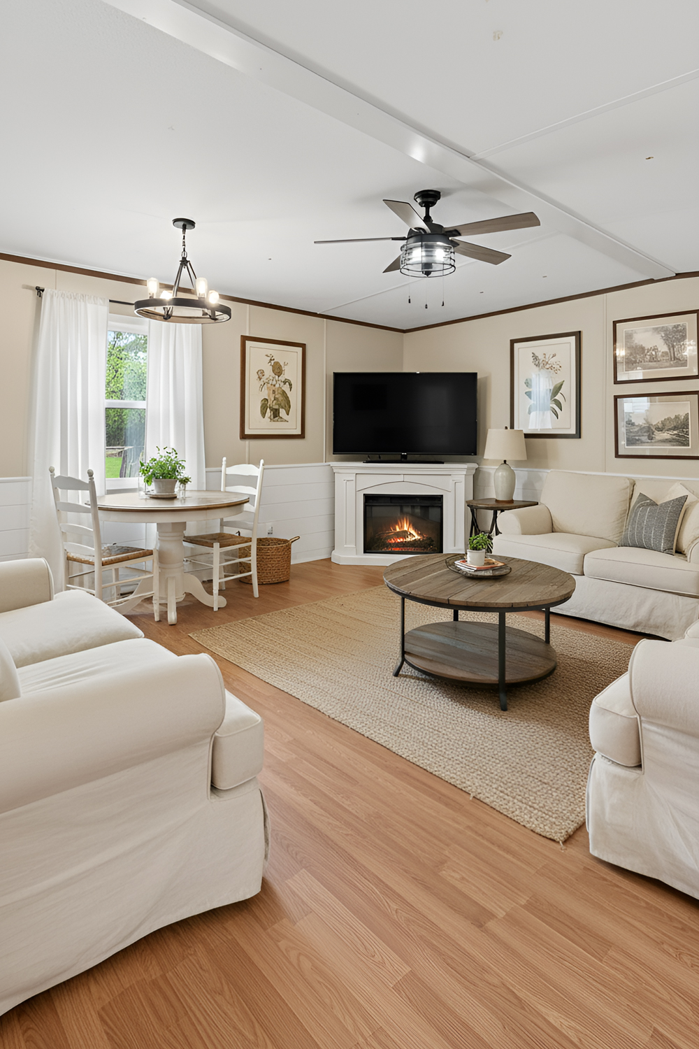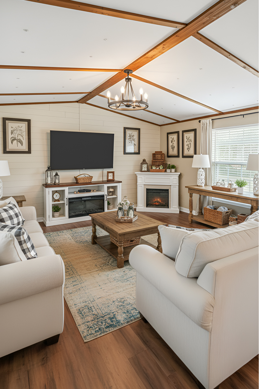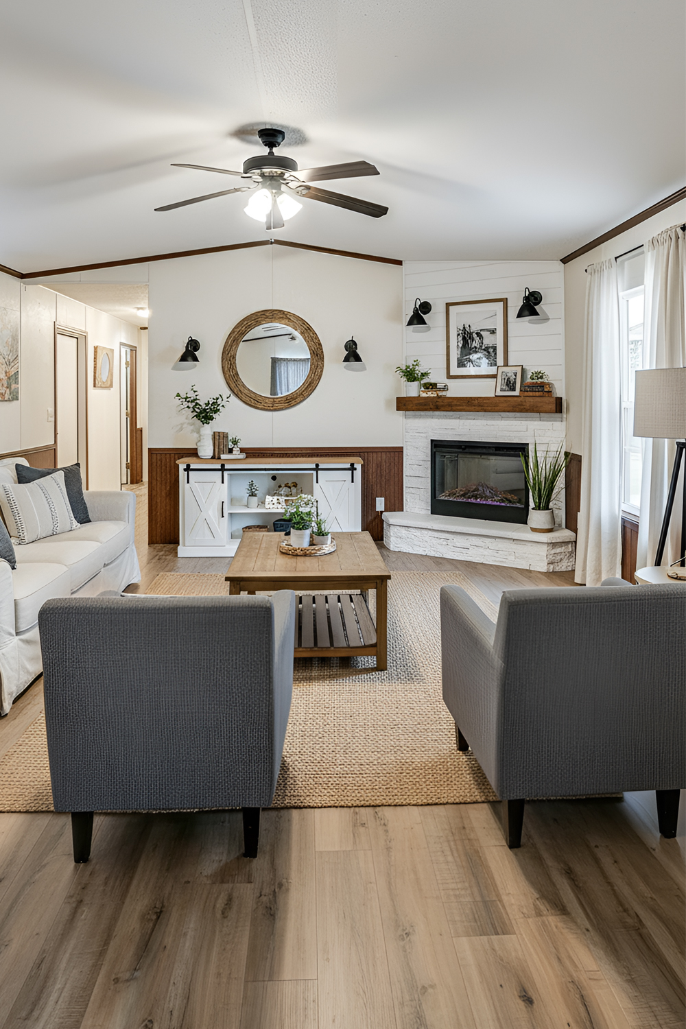 A mobile home living room with a corner fireplace needs furniture that fits the scale of the room. That means pieces should feel comfortable, but not oversized. It also means you should avoid too many heavy shapes in one area.