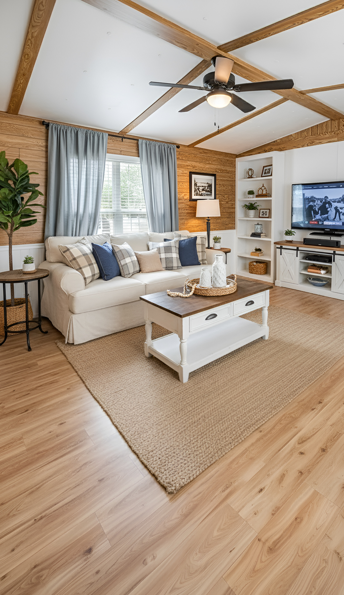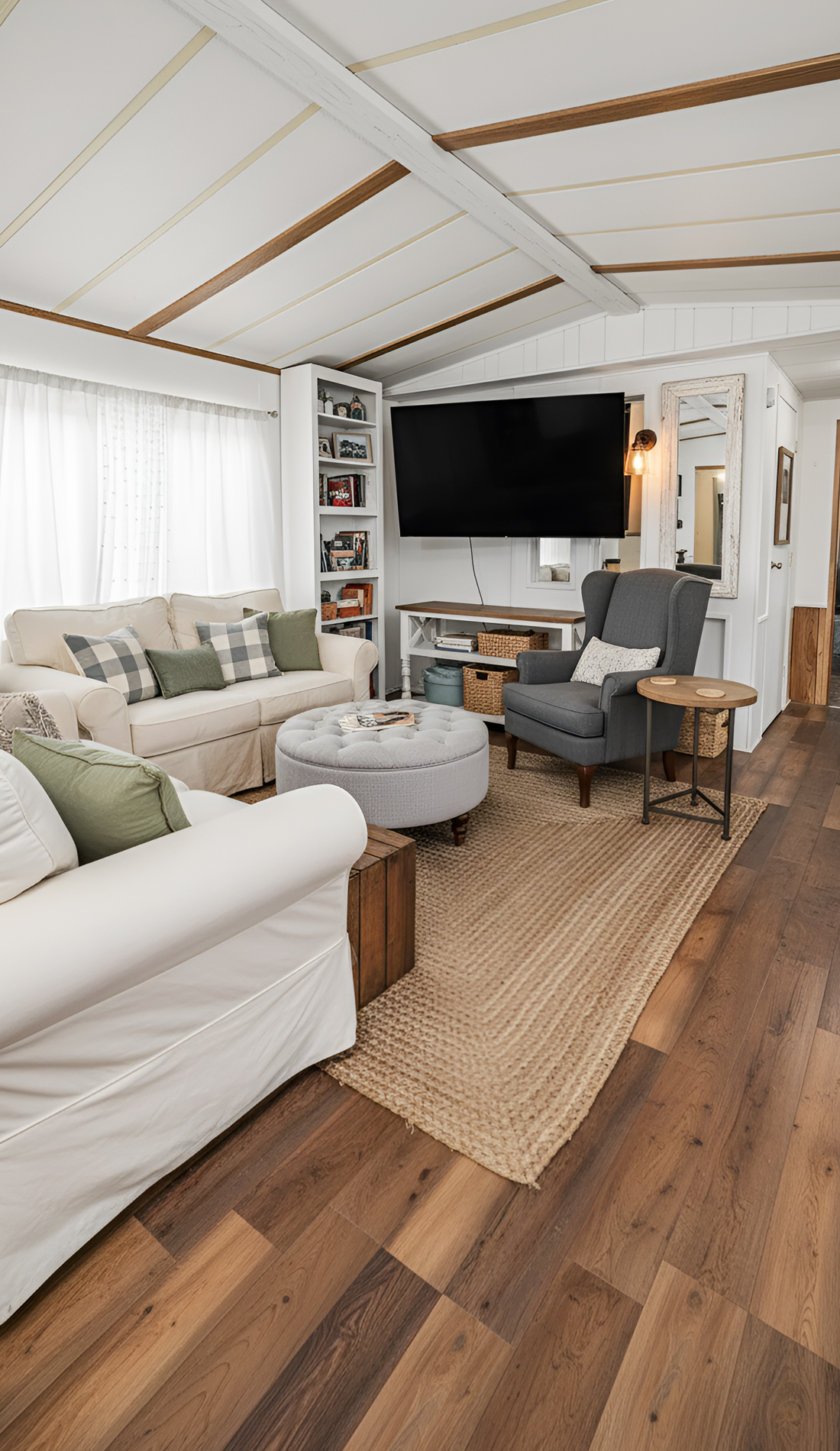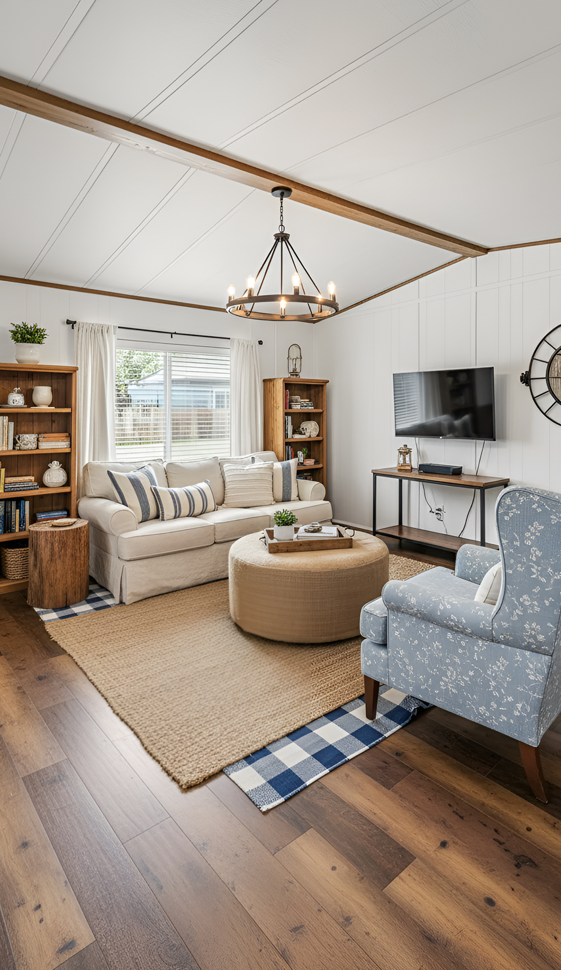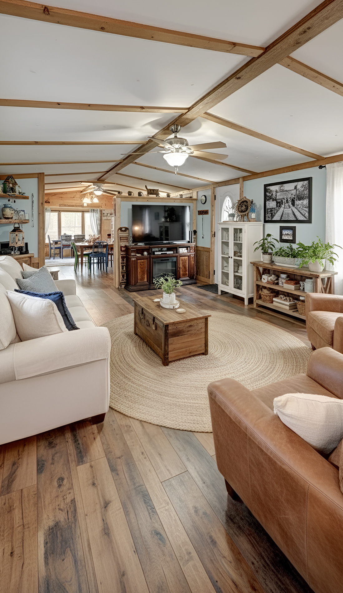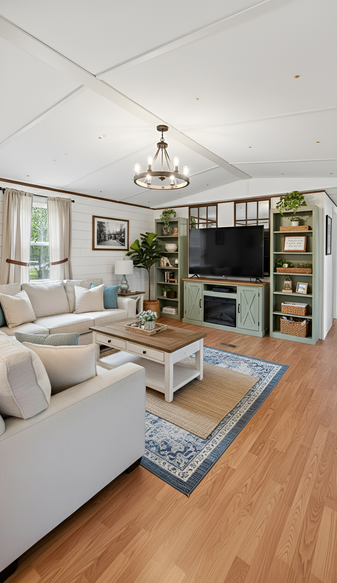 A single wide mobile home living room can feel just as warm, stylish, and inviting as any larger space. The secret is all in the details. Think cozy textures, soft rugs, wood ceiling beams, farmhouse furniture, and a layout that makes every inch count. These beautiful living rooms show how farmhouse design can make a single wide feel bright, charming, and full of personality.
