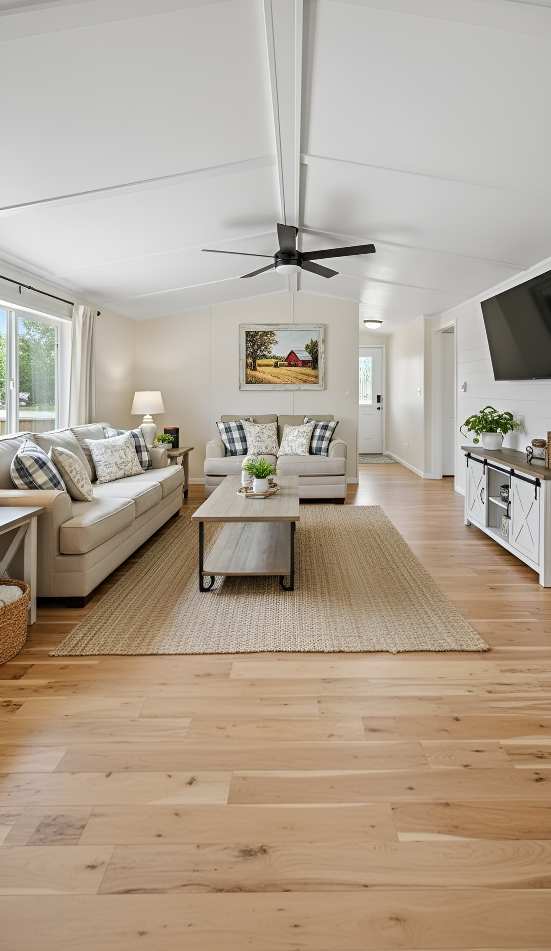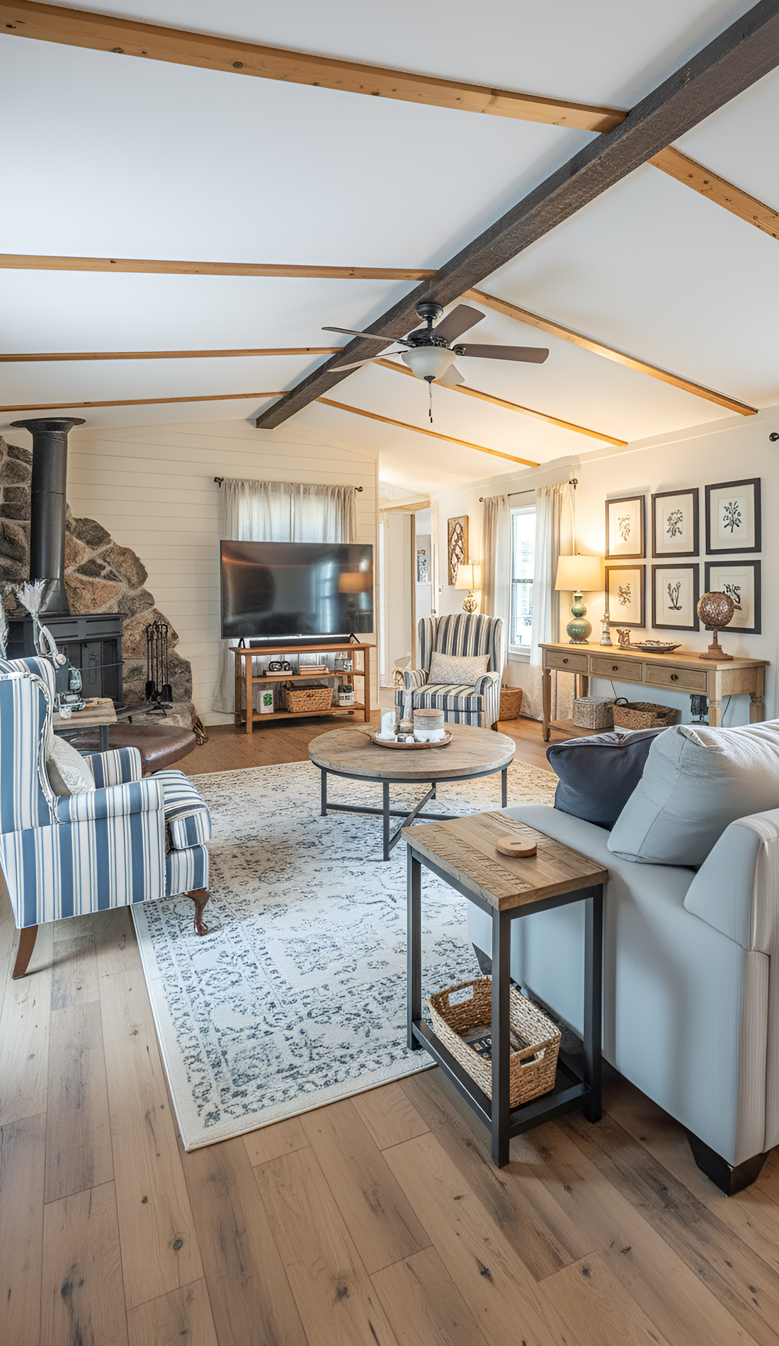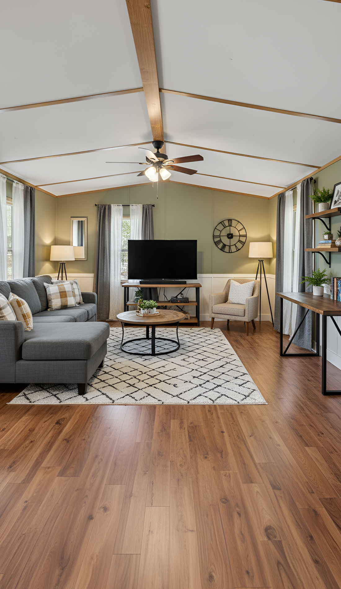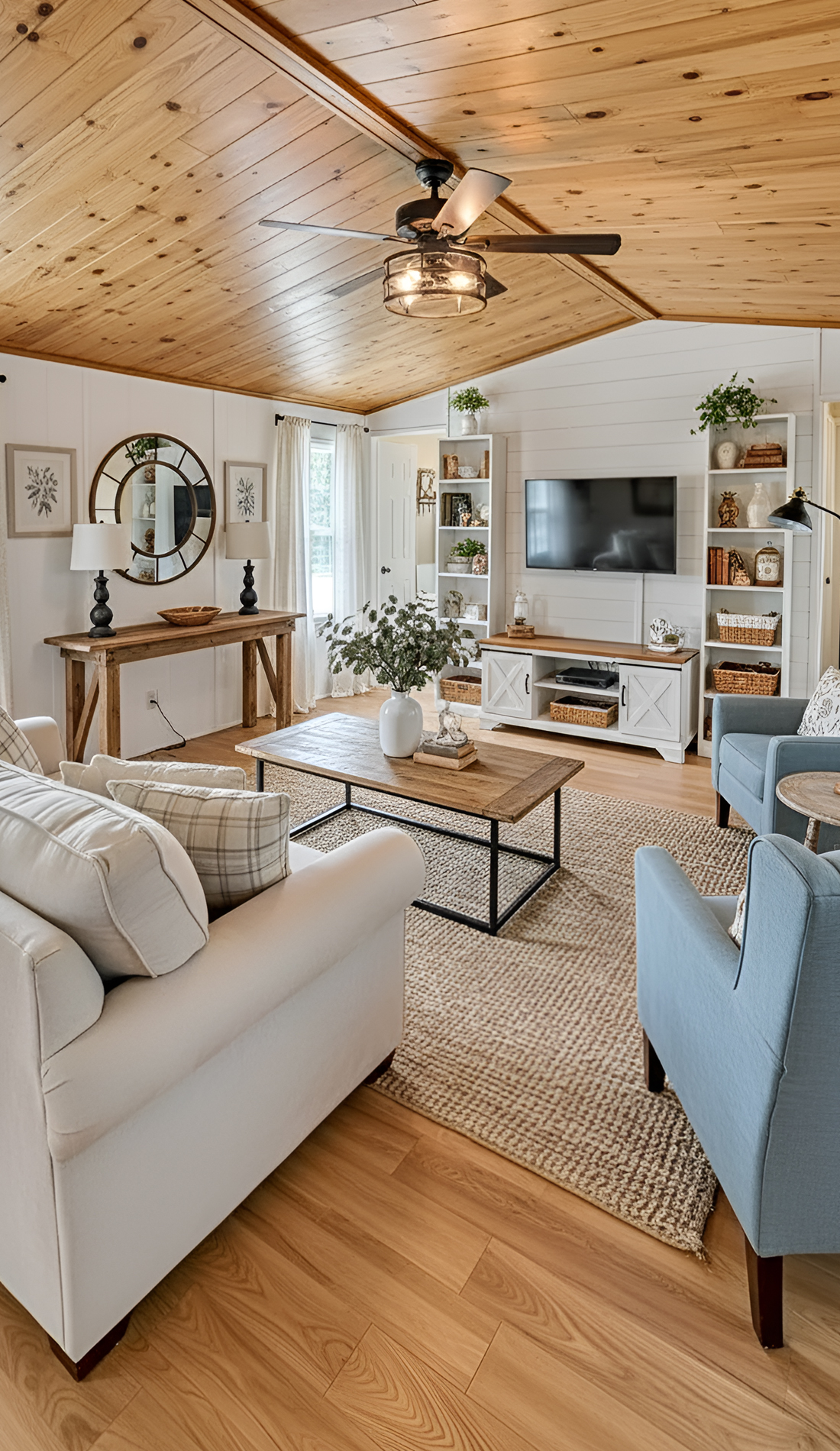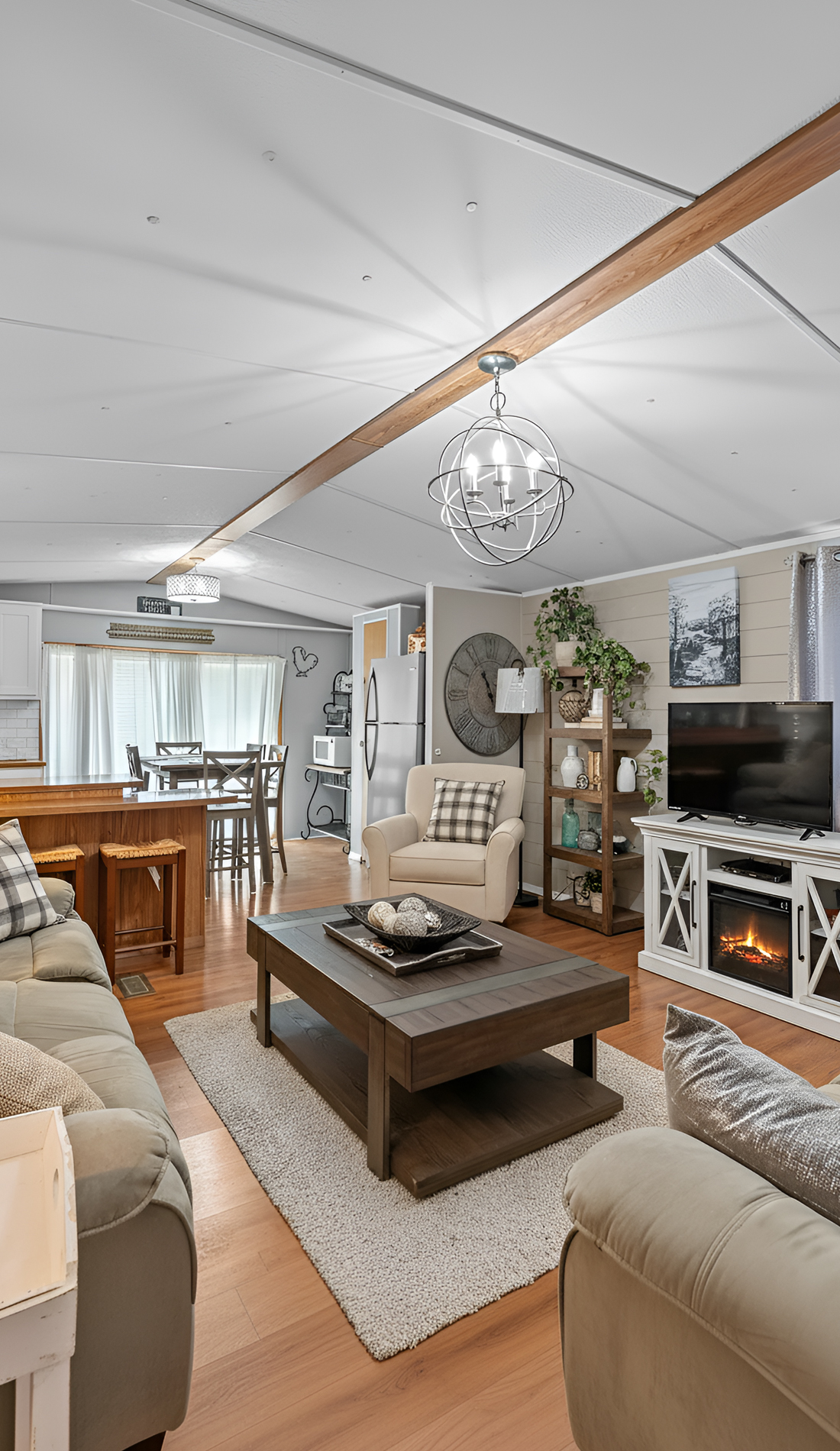A single wide mobile home living room can feel just as warm, stylish, and inviting as any larger space. The secret is all in the details. Think cozy textures, soft rugs, wood ceiling beams, farmhouse furniture, and a layout that makes every inch count. These beautiful living rooms show how farmhouse design can make a single wide feel bright, charming, and full of personality.