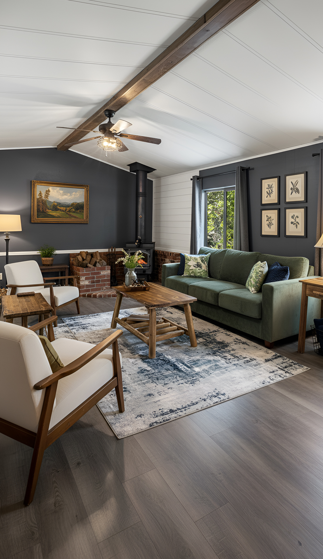 This design also uses contrast very well. The dark sofa against the dark wall blends in softly, while the cream chairs stand out. That mix creates depth. The art piece over the loveseat adds a calm focal point and fits the woodland farmhouse mood.