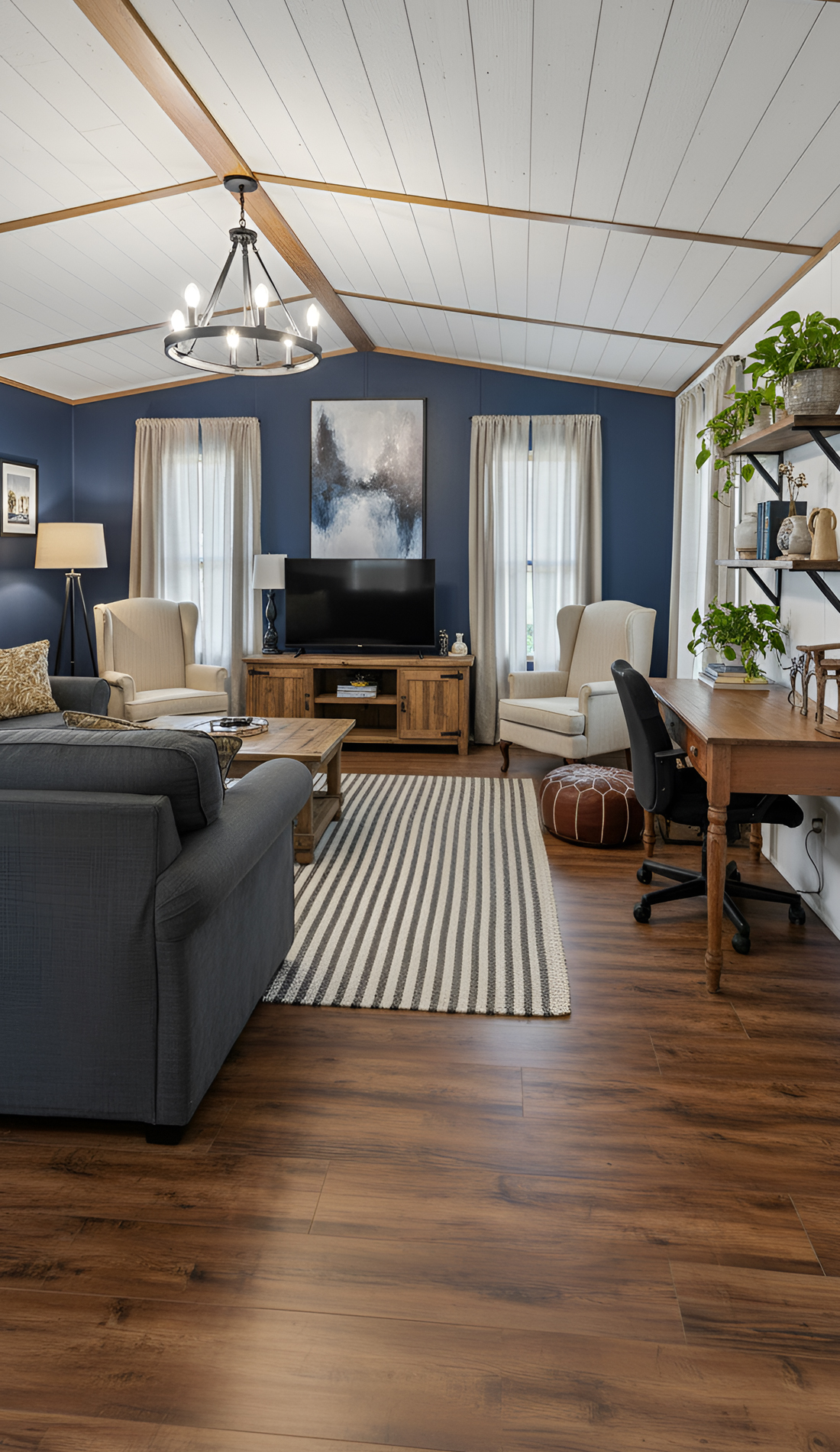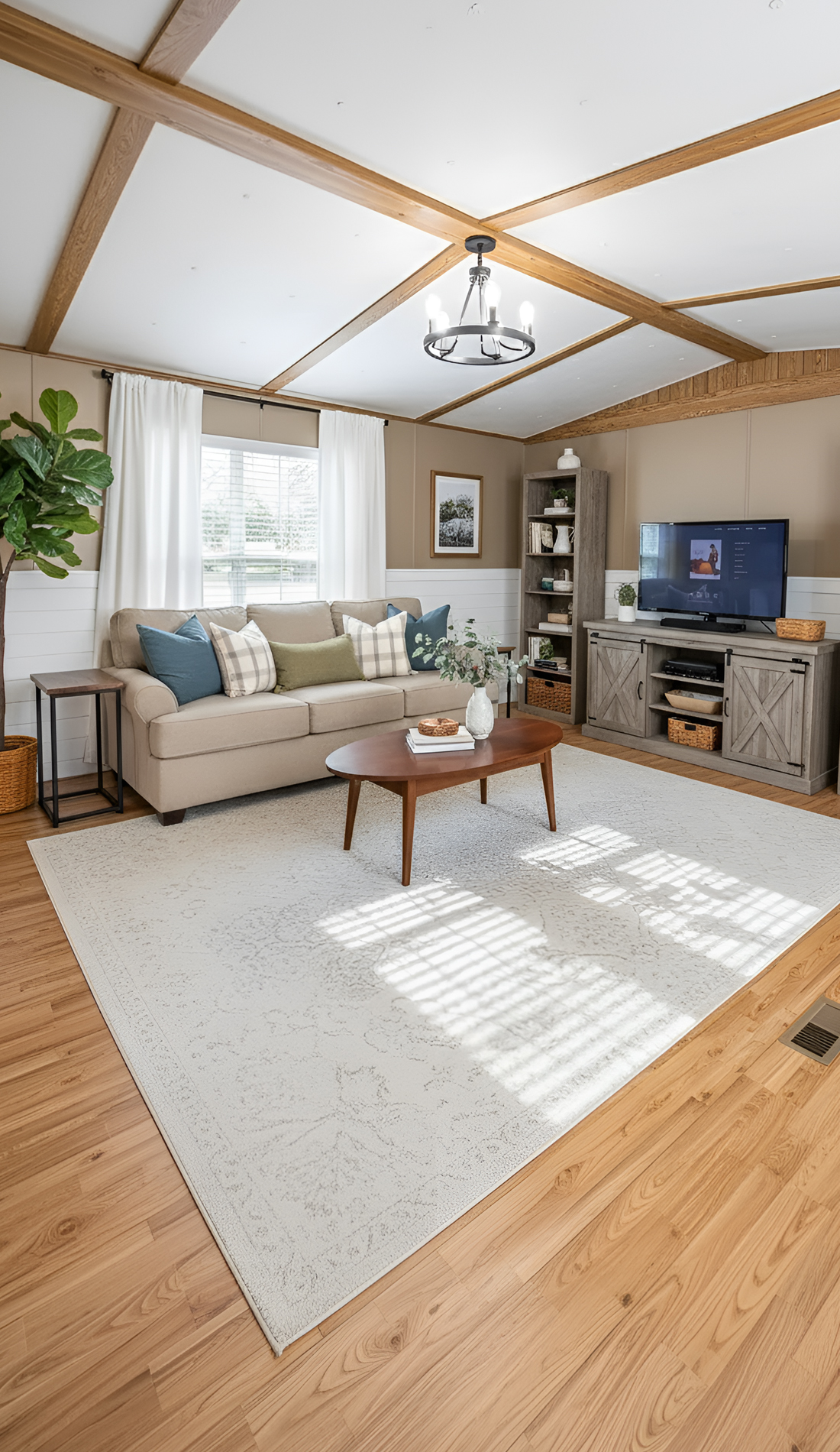 The ceiling beams play a big role here. They break up the large white ceiling and give the room quiet structure. Because the beams are slim and painted white, they keep the look crisp rather than rustic-heavy. That works well in a single wide where too much visual weight can close the room in.
