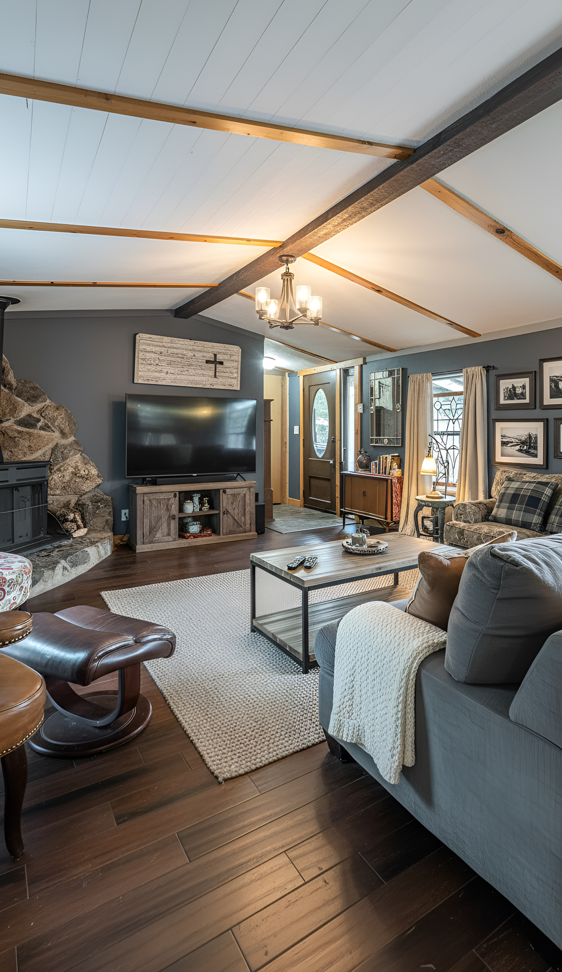 This design also handles a longer single wide layout well. The seating is grouped around the rug, while the fireplace and TV anchor one end. The result is a room that feels intimate even in a more open footprint.