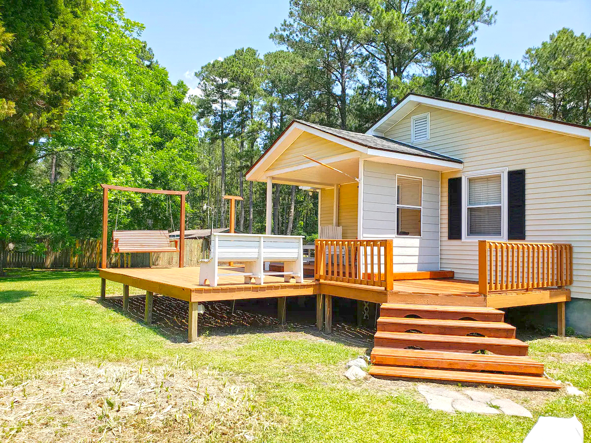 This design proves you don’t need a giant deck to get a big lifestyle boost. The porch section near the door stays compact, which keeps the entry clean and simple. Then the side deck adds the “fun.” That’s where the swing frame creates a destination.