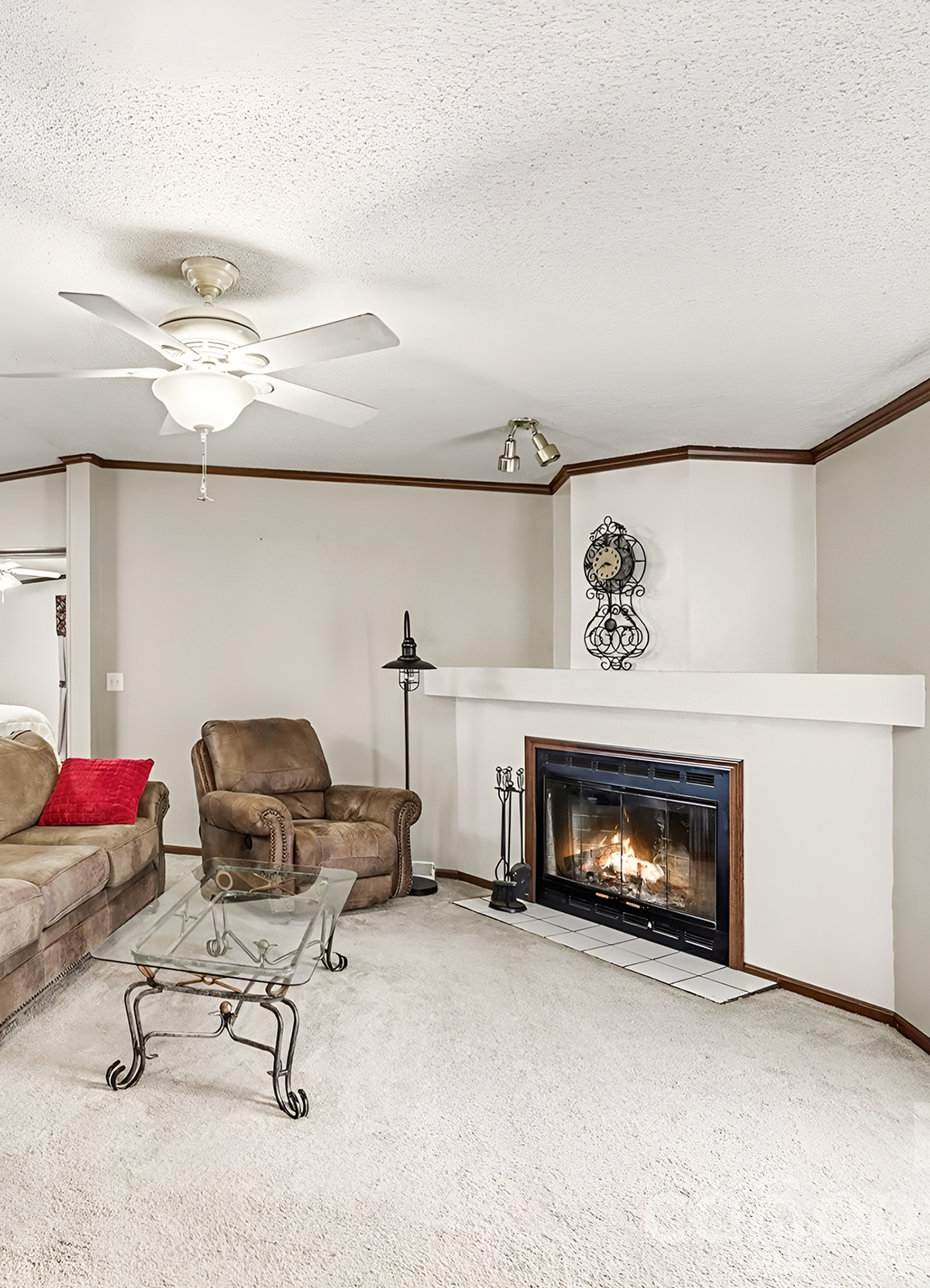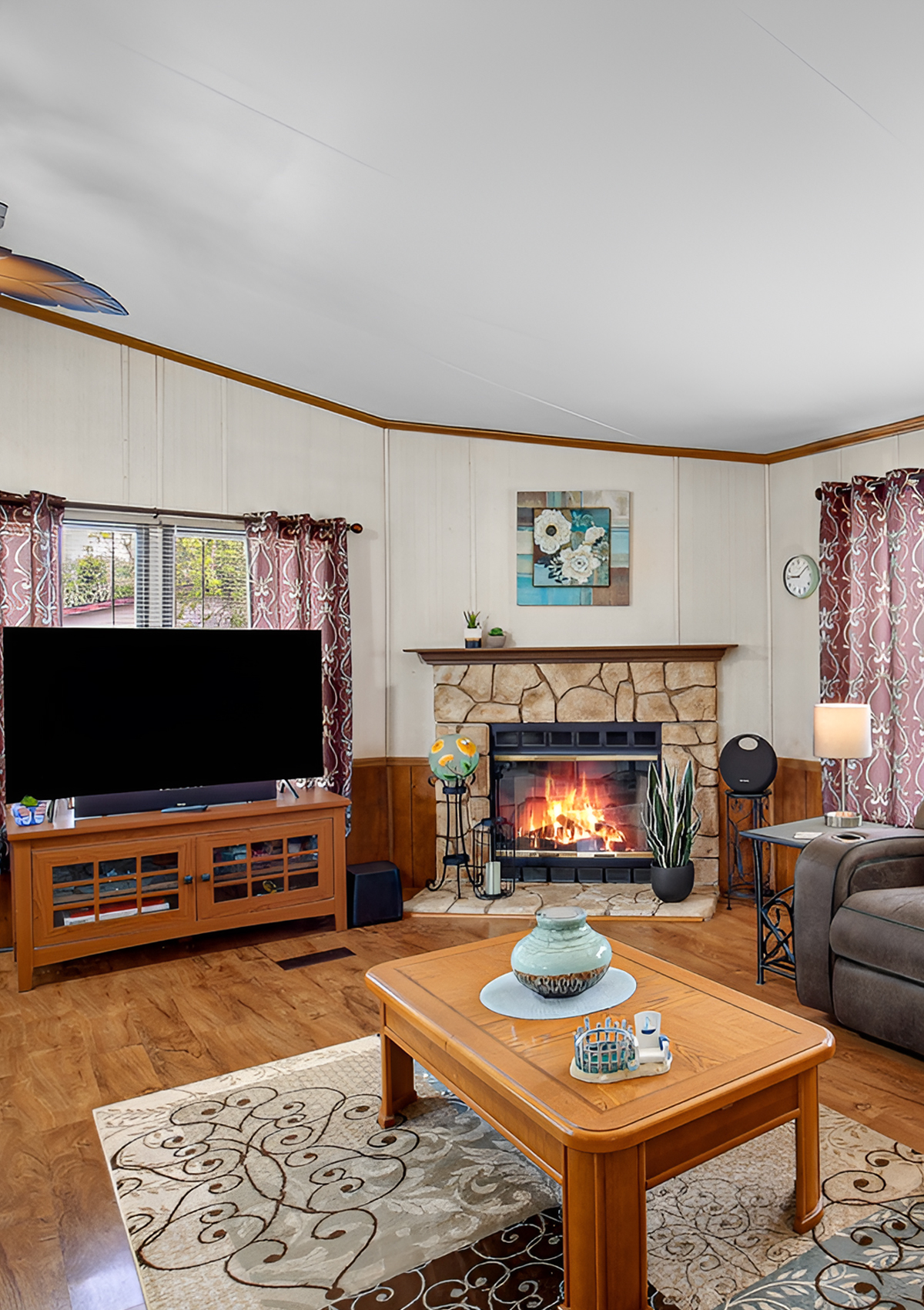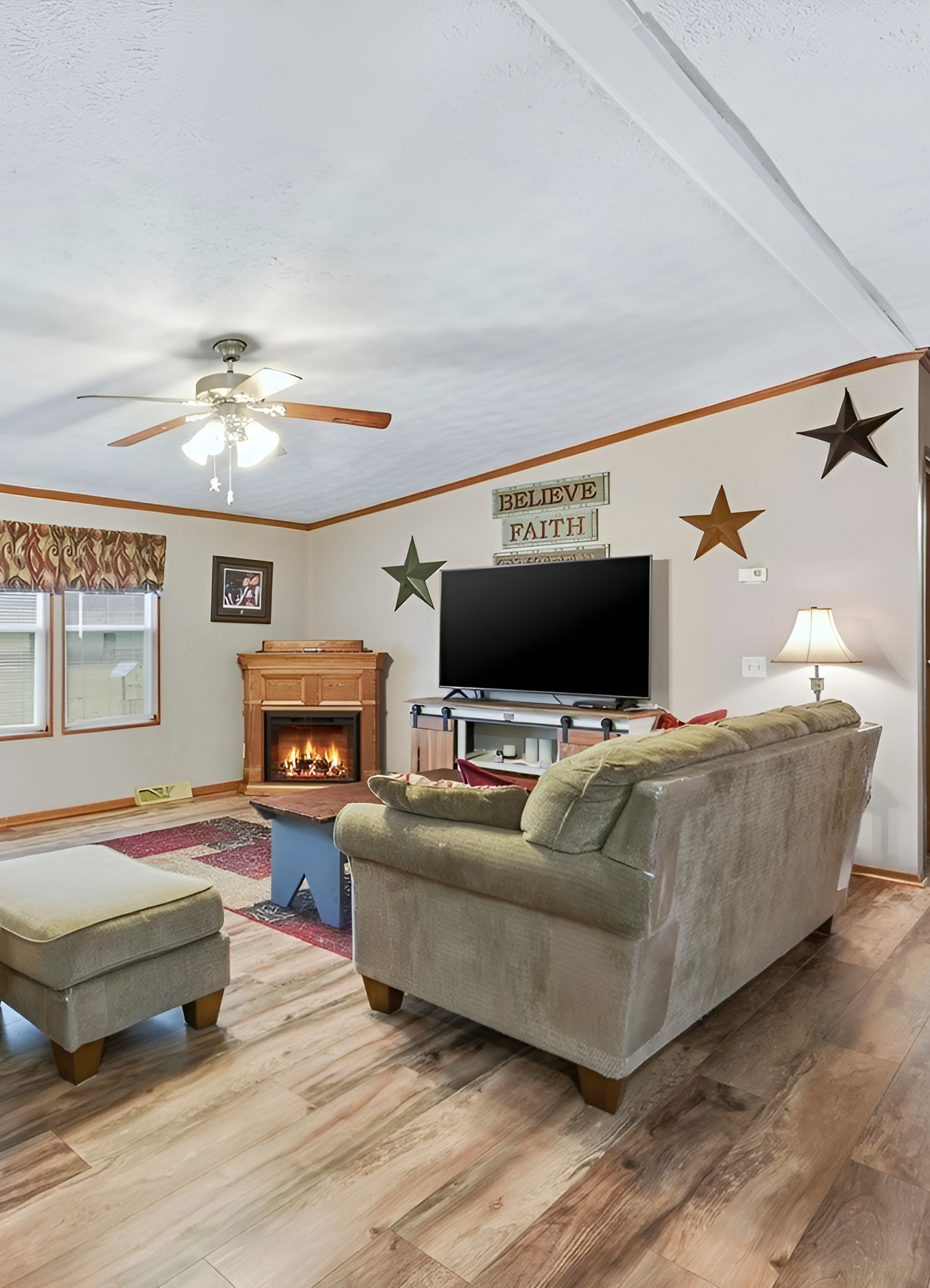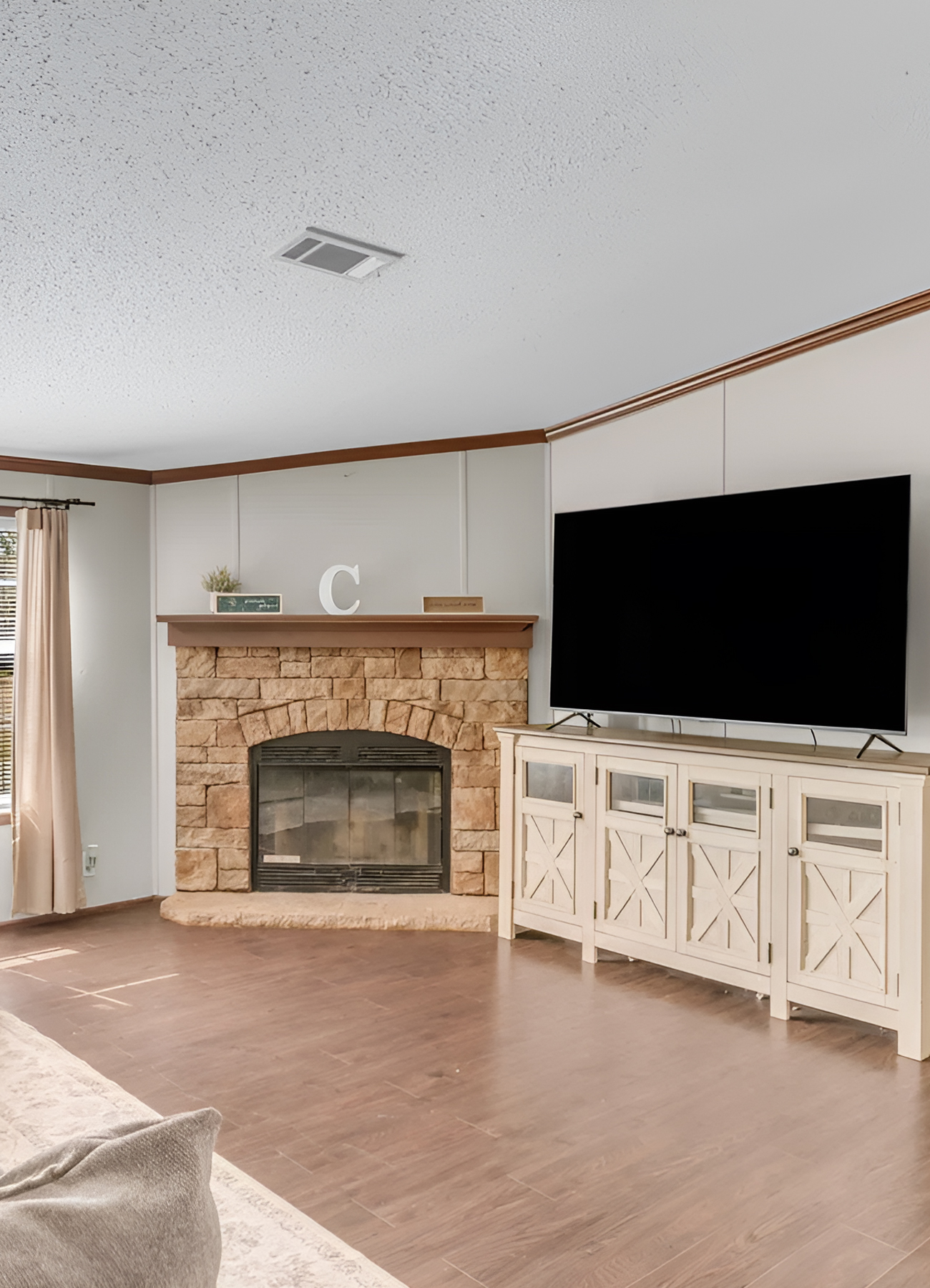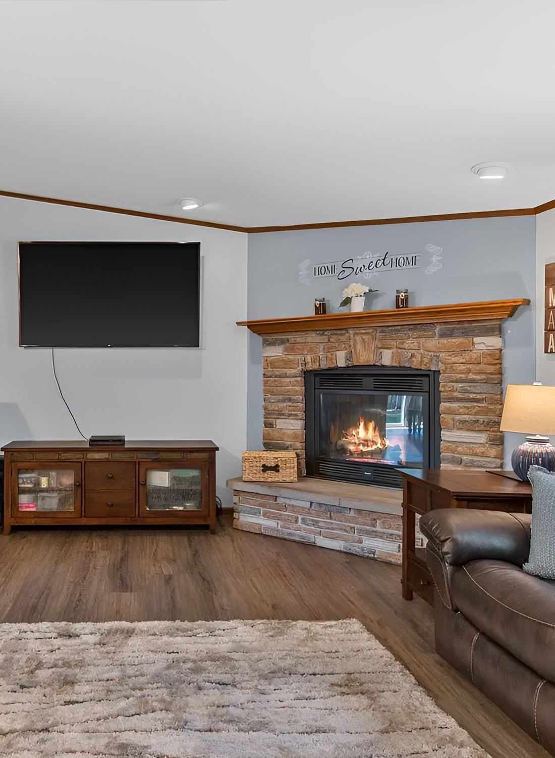 This room uses a corner fireplace while giving the TV its own wall. That balance works well in busy family rooms. The fireplace still brings warmth and style, but the media wall handles everyday viewing. That way, the hearth does not have to carry everything. The result feels easy and lived in. In a double wide, this setup is useful when you want furniture to face the TV without losing the comfort of a real fireplace.