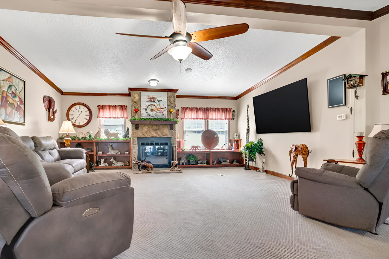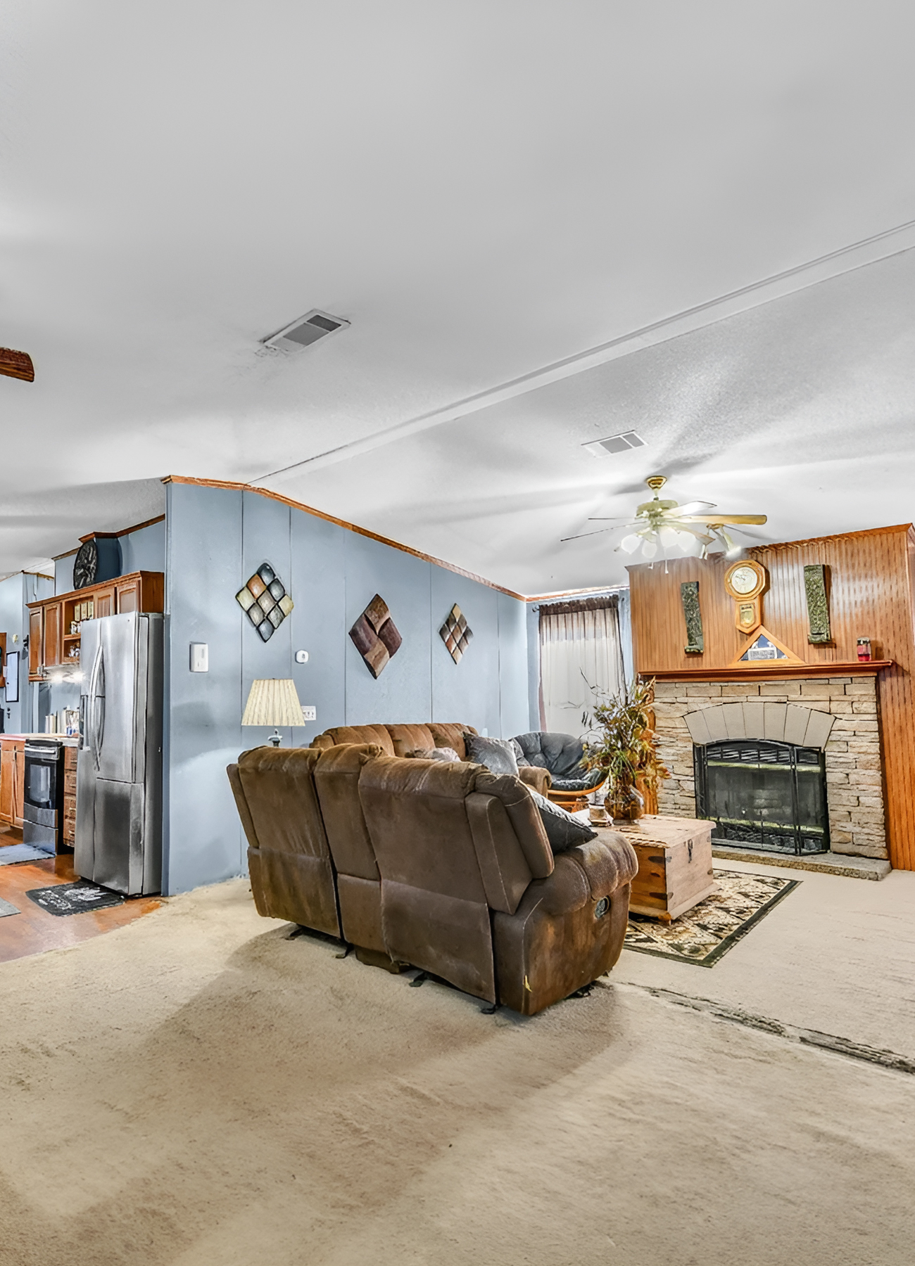This room uses a fireplace as part of a larger center mass, and that gives the layout strong structure. The hearth sits beyond the seating area, while the kitchen wraps nearby. That creates a natural living room zone without full walls. In a double wide, that kind of placement helps a large open plan feel less flat. The fireplace becomes a visual landmark. It tells you where the family room begins, even when the kitchen sits only a few steps away.