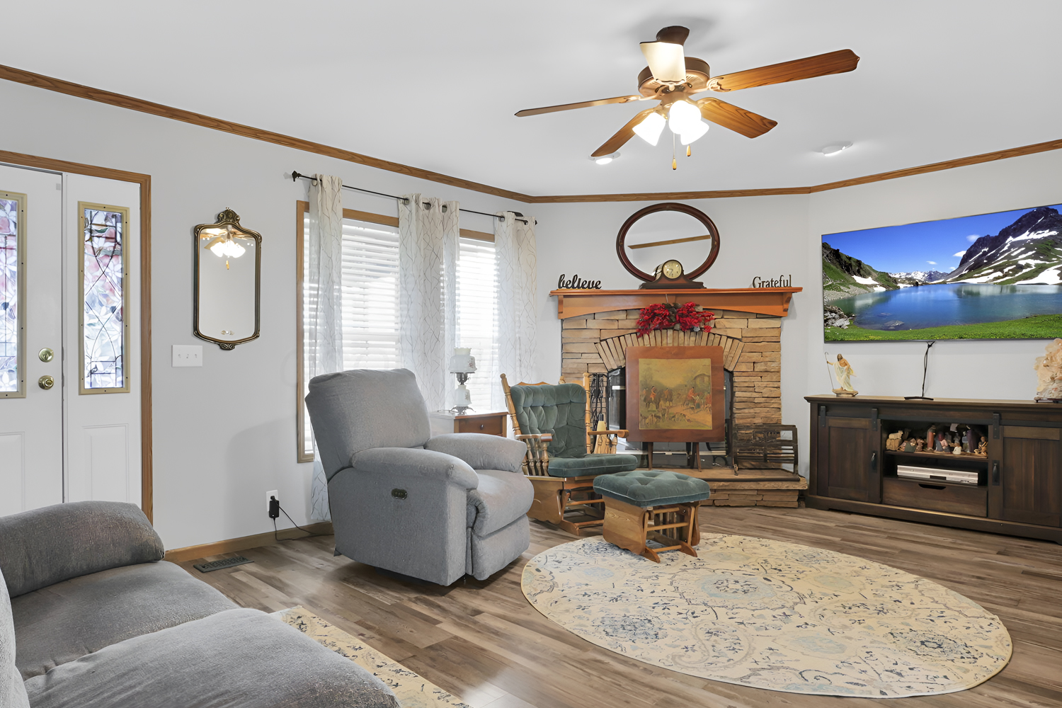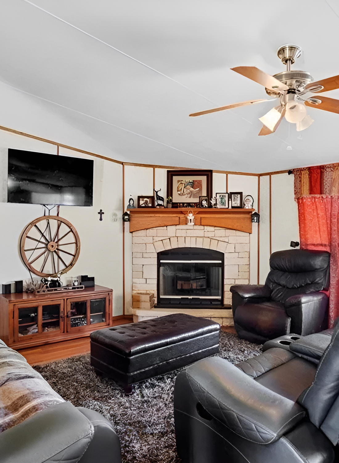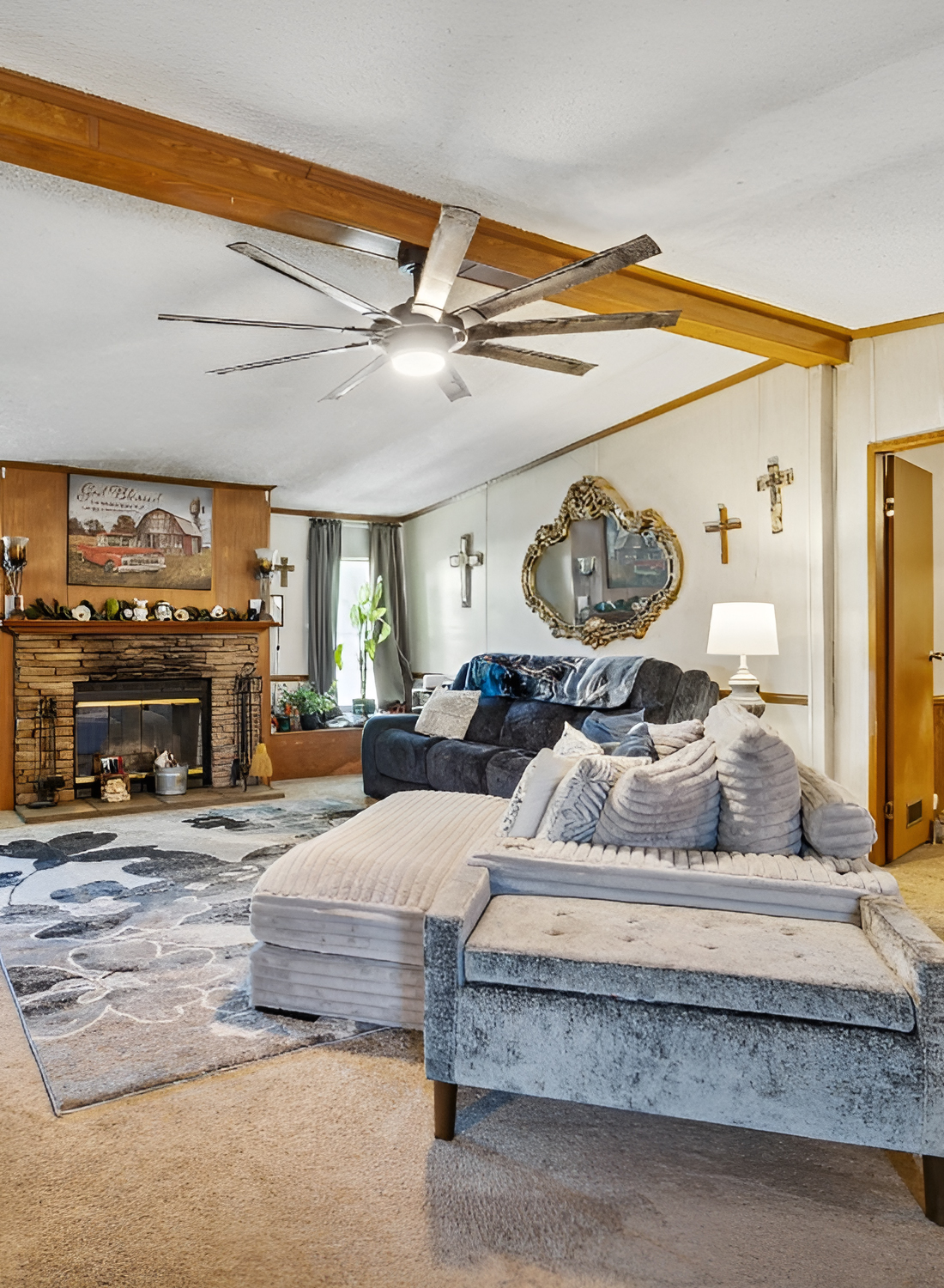 Not every double wide needs a massive hearth. This smaller fireplace shows how a simple end-wall placement can still feel warm and inviting. It sits at the far end of the room and becomes a quiet destination. Because the fireplace is compact, the seating can stay relaxed and spread out. The room feels easy, not crowded. This kind of layout works well for homes that need comfort first and drama second.