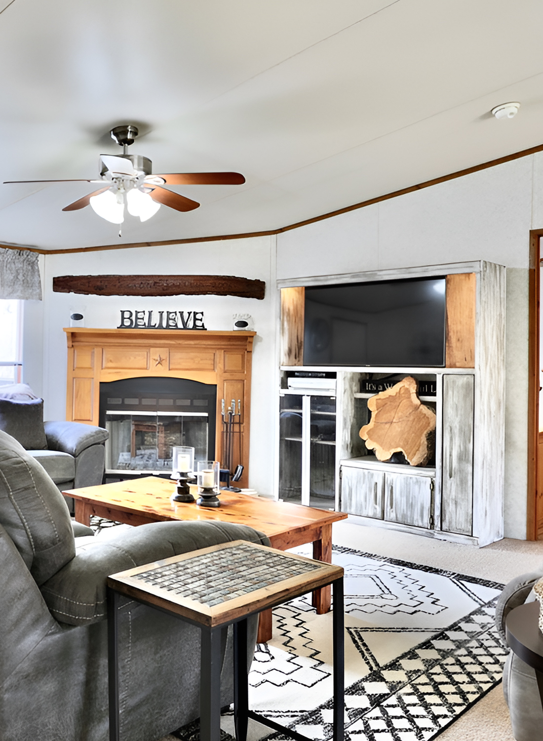 This room blends the fireplace and media cabinet into one rustic focal zone. That is a very practical move in a double wide because it keeps the room from feeling split between two competing walls. The fireplace still has charm, but the TV and storage work with it instead of against it. The wood beam above adds height and texture, so the whole setup feels more custom. It is a smart option when you want function and character in the same spot.