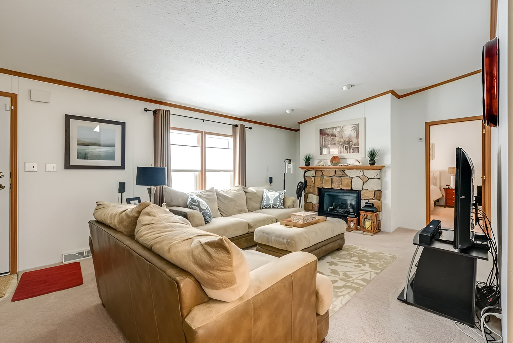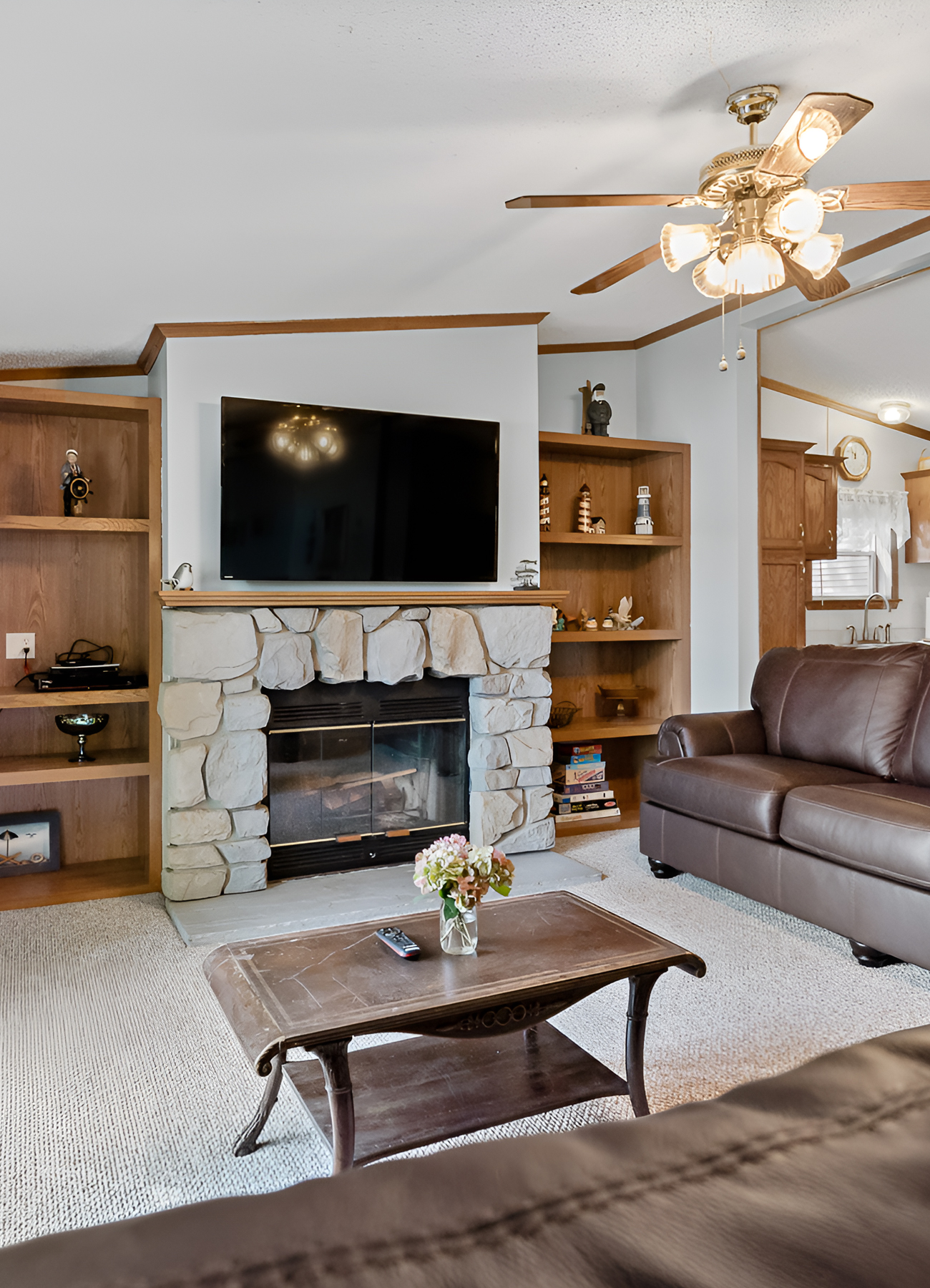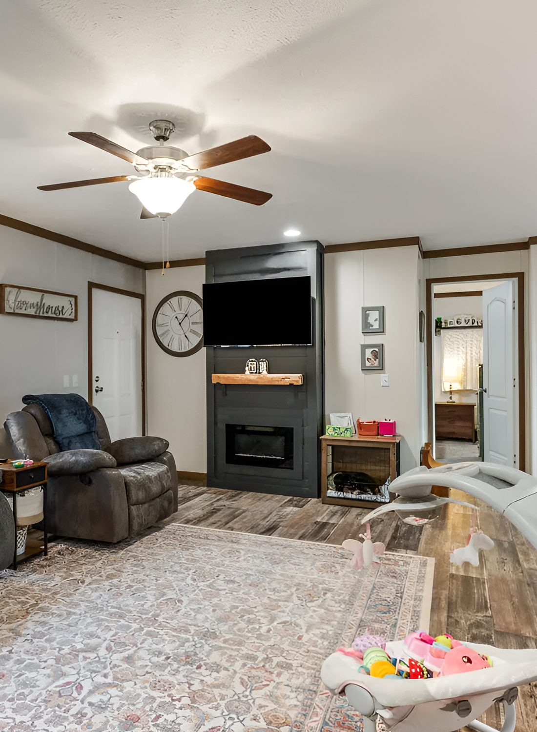 This final room shows a very common and very useful double wide strategy. The fireplace sits on a partial wall between the living area and the kitchen. That lets it face the seating zone while still relating to the rest of the open plan. The wall also gives a place for the TV above, which saves space elsewhere. The result feels practical, warm, and easy to live with. It is not flashy, but it works.