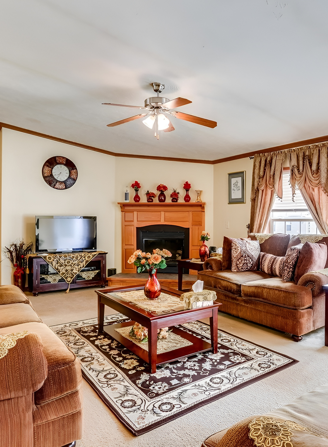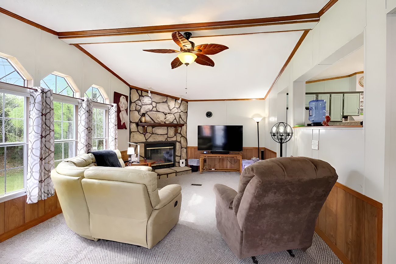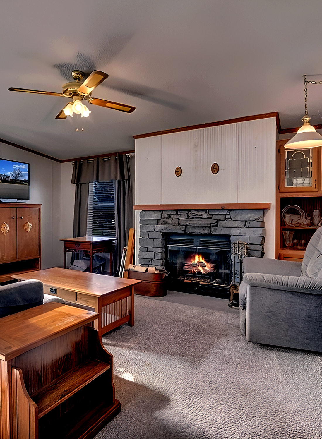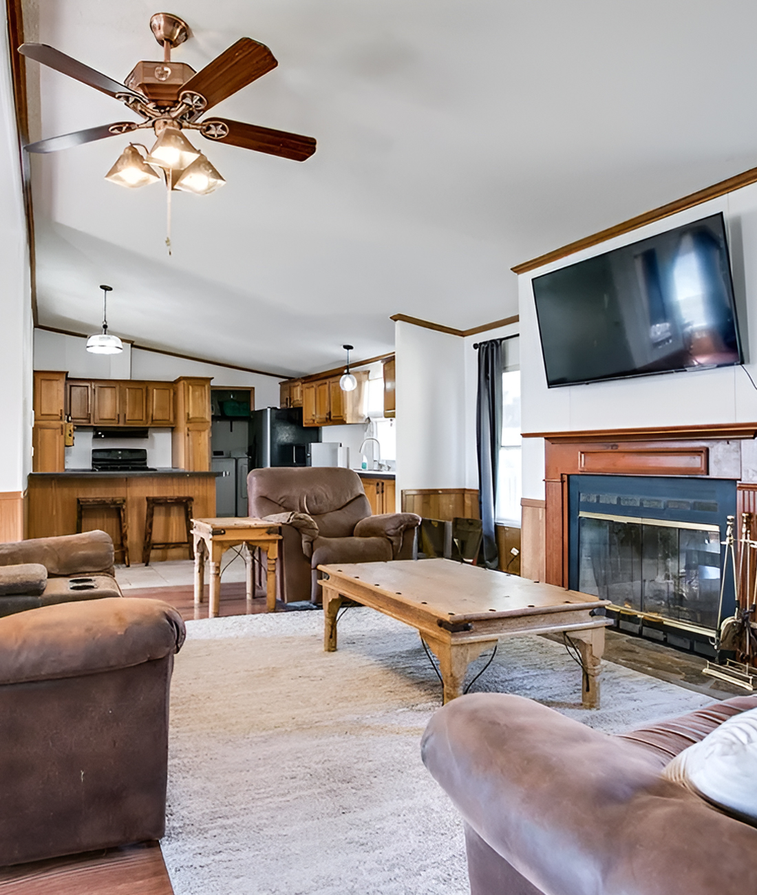 This final room shows a very common and very useful double wide strategy. The fireplace sits on a partial wall between the living area and the kitchen. That lets it face the seating zone while still relating to the rest of the open plan. The wall also gives a place for the TV above, which saves space elsewhere. The result feels practical, warm, and easy to live with. It is not flashy, but it works.