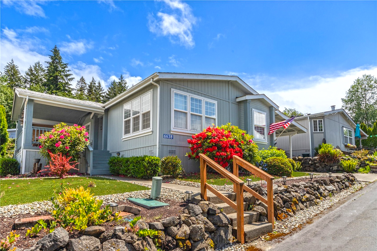This design also hides “park” views well. The planting frames the home and pulls your eye to the entry instead of the neighbors.