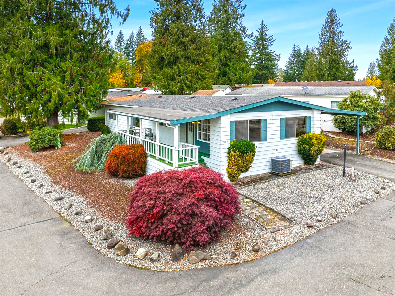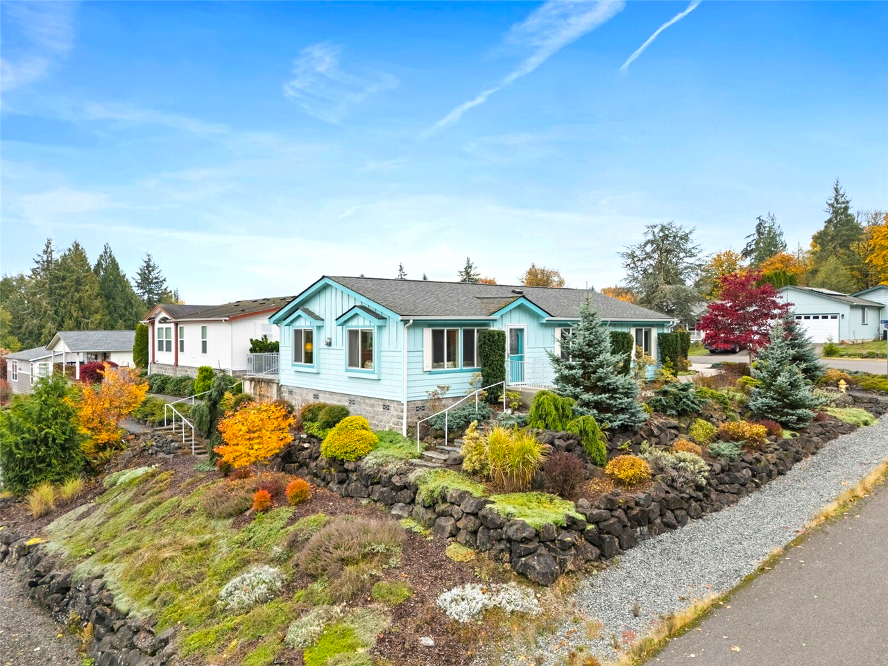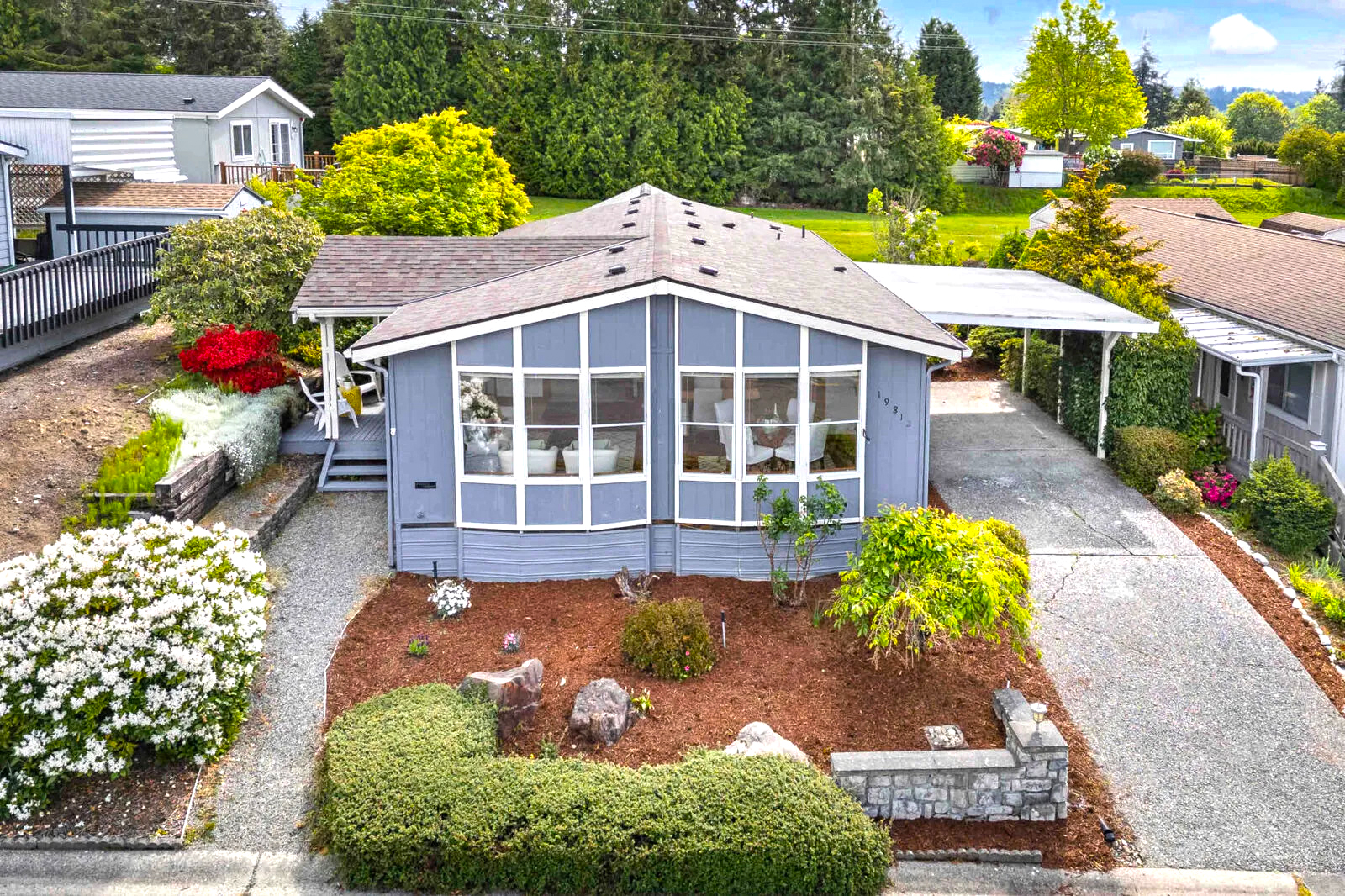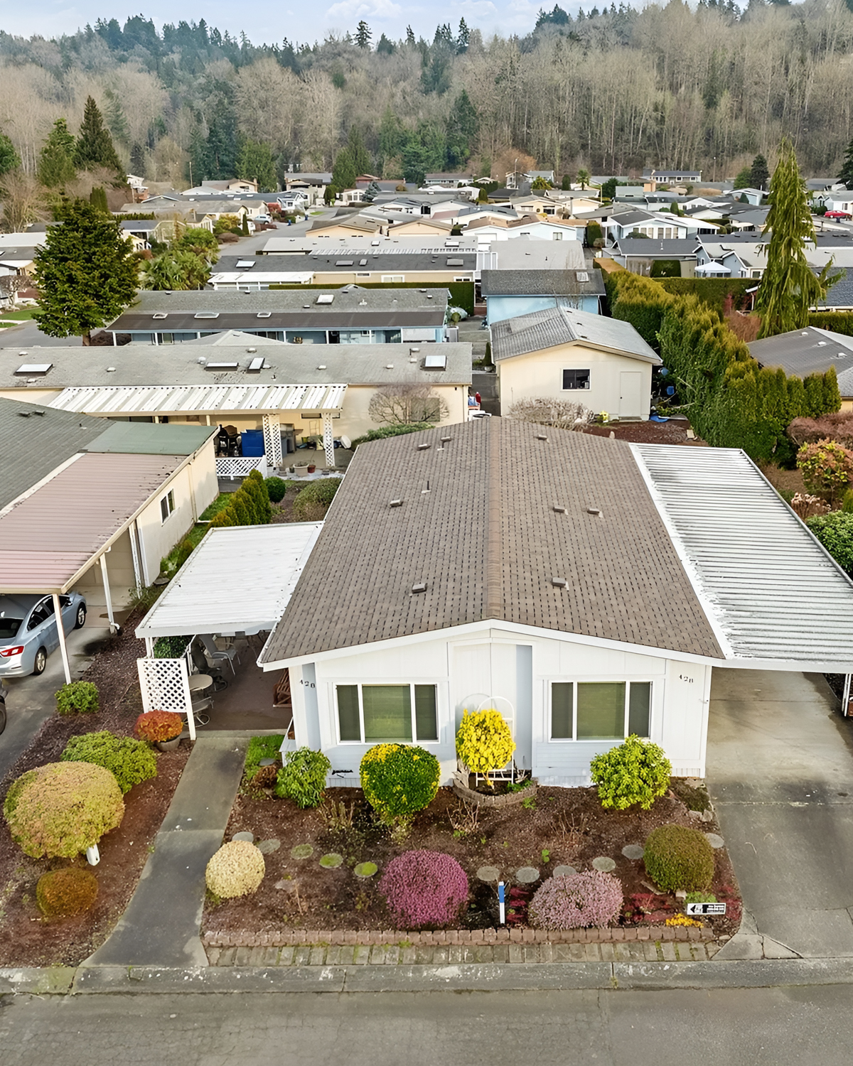 This aerial view shows a powerful layout cue. The planting bed wraps the corner like a ribbon. That makes the home feel grounded on the lot, not just dropped in place.