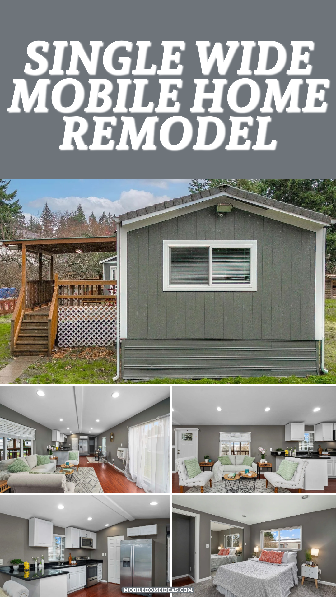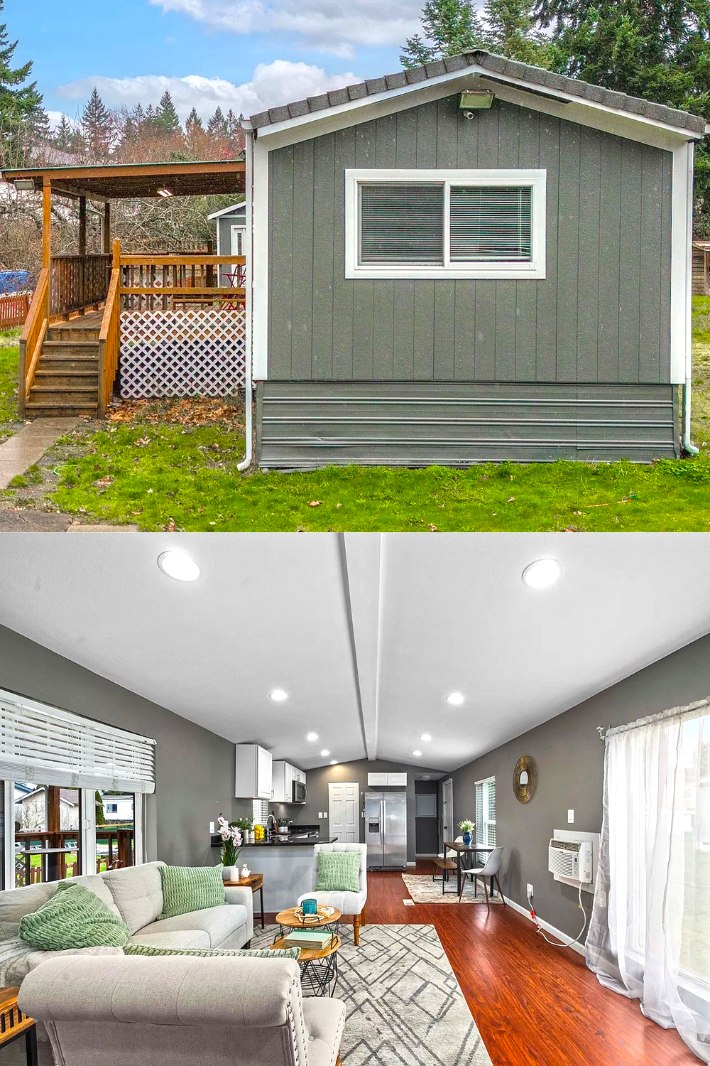 Let’s start outside. This mobile home stands out right away thanks to its modern color. The siding is painted a deep, stylish gray. Clean white trim frames every window and door. Together, they make the house look crisp and neat. The colors feel cool and calm.