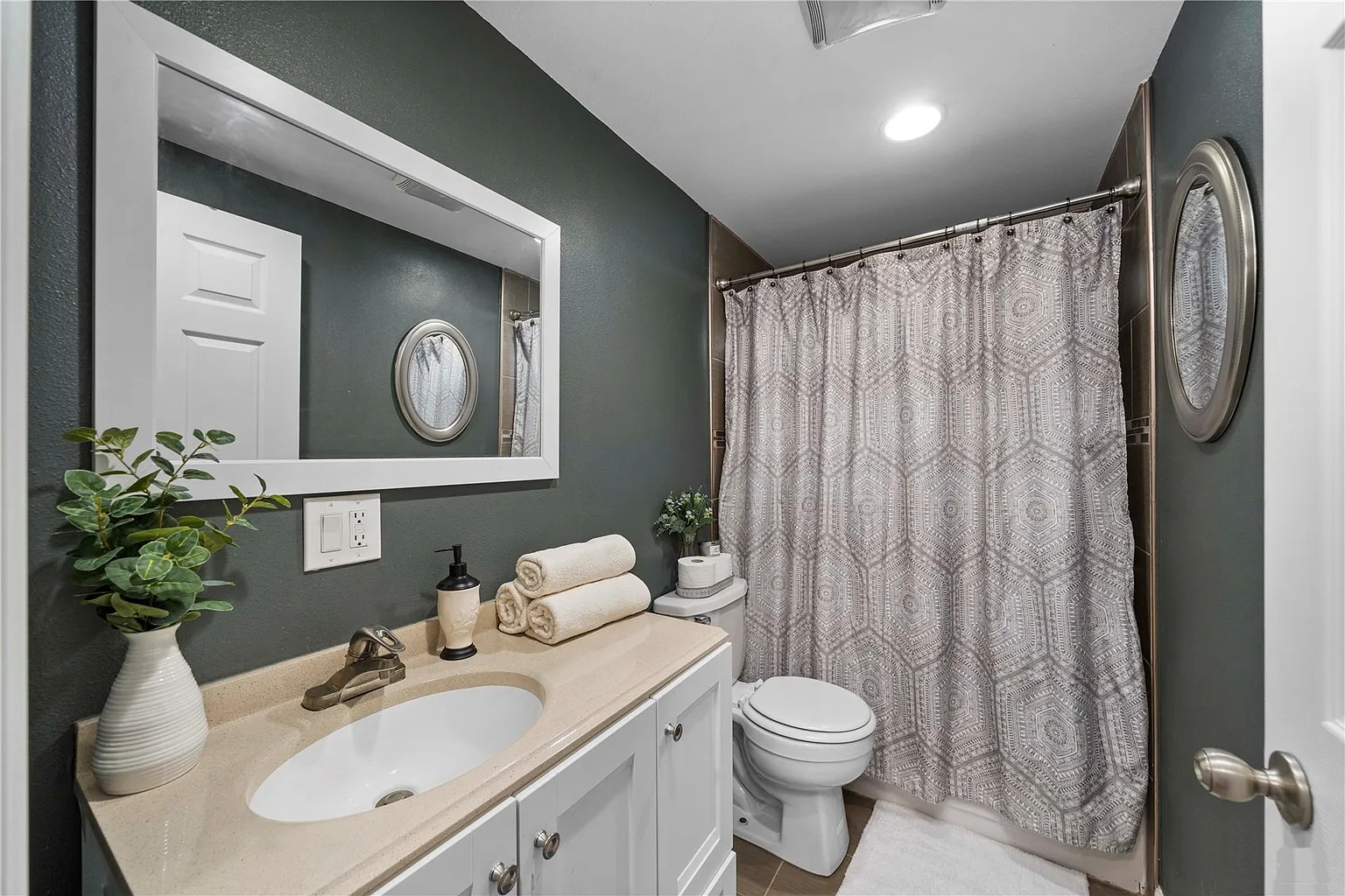 Step into the bathroom and you’ll find another big surprise. The walls are painted a rich, deep green. It’s bold, but it feels peaceful. A large white-framed mirror hangs over the sink. It helps the room feel bigger and reflects all the light.