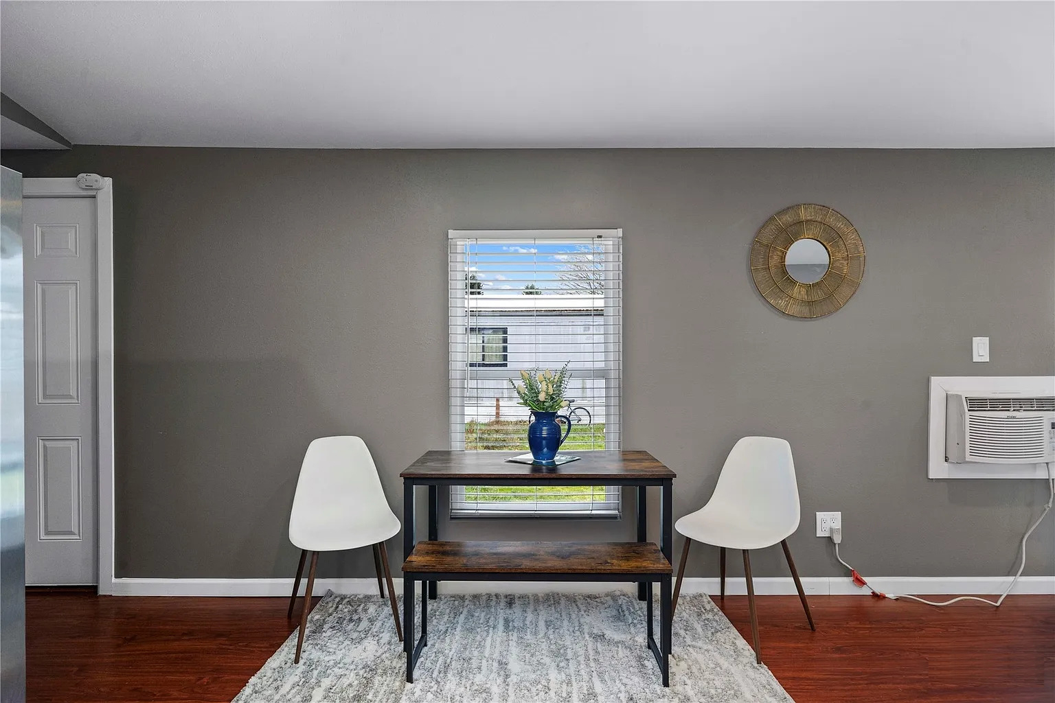 The dining nook is just right for this home. It’s tucked between the kitchen and a window, making it a sunny spot for meals. There’s a small, round table and two modern chairs. The look is clean and uncluttered.