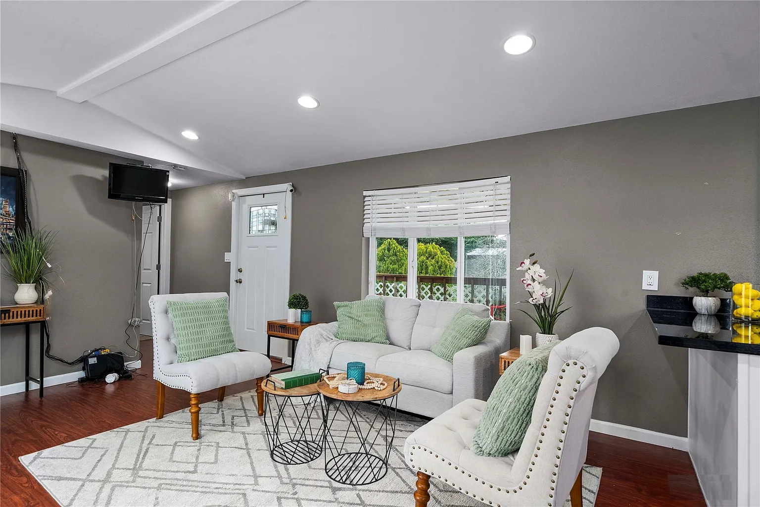 The walls are painted a soft, warm gray. It’s a relaxing color that works well with everything. Plush carpet underfoot feels soft and inviting. The furniture is simple and comfy. There’s a light-colored sofa with cozy green pillows. Two soft chairs sit close by, ready for guests. A patterned rug in soft gray adds another layer of comfort.
