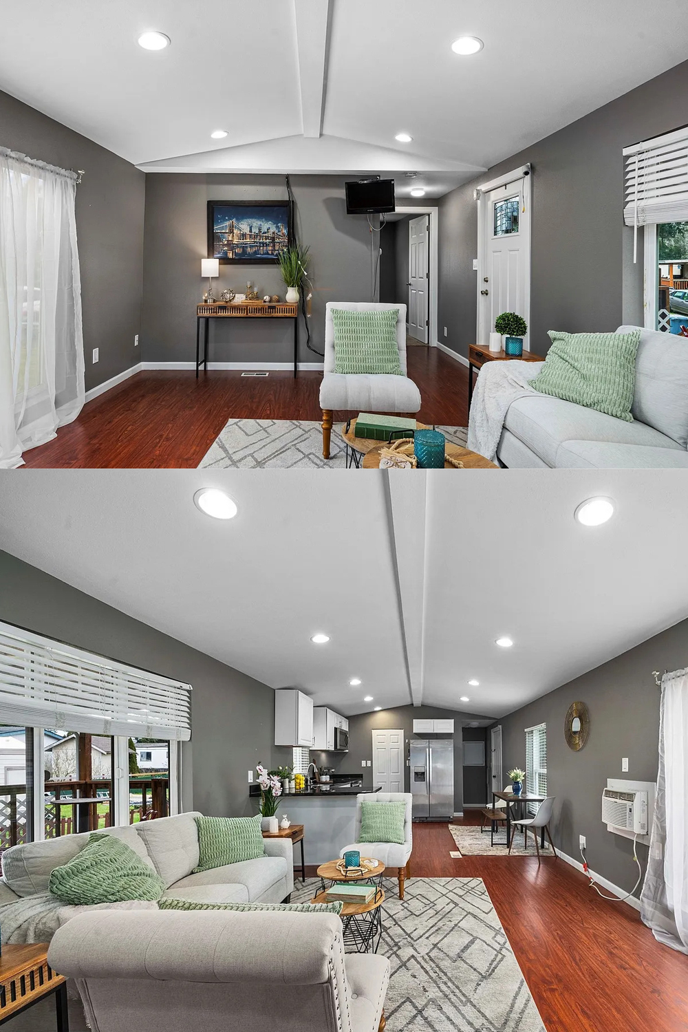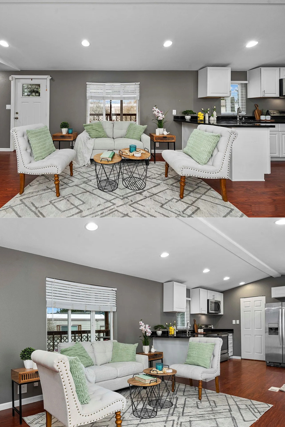 This single wide feels put together from top to bottom. The color scheme is soft and simple: lots of gray, white, and gentle green. This makes every room flow into the next.