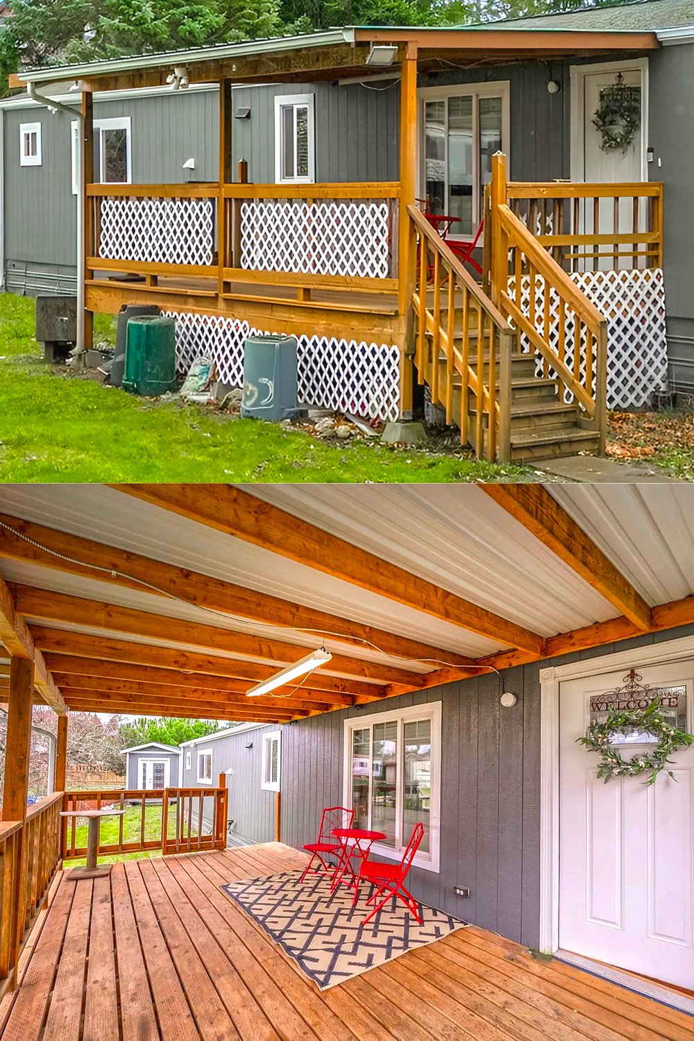 Now look at that porch! It’s a true “welcome home” moment. Natural wood makes the space feel warm and friendly. Lattice panels along the bottom add a bit of classic charm. The wide steps and sturdy railings invite you to come up and relax. You can almost picture yourself sitting out here with a cold drink on a sunny day.
