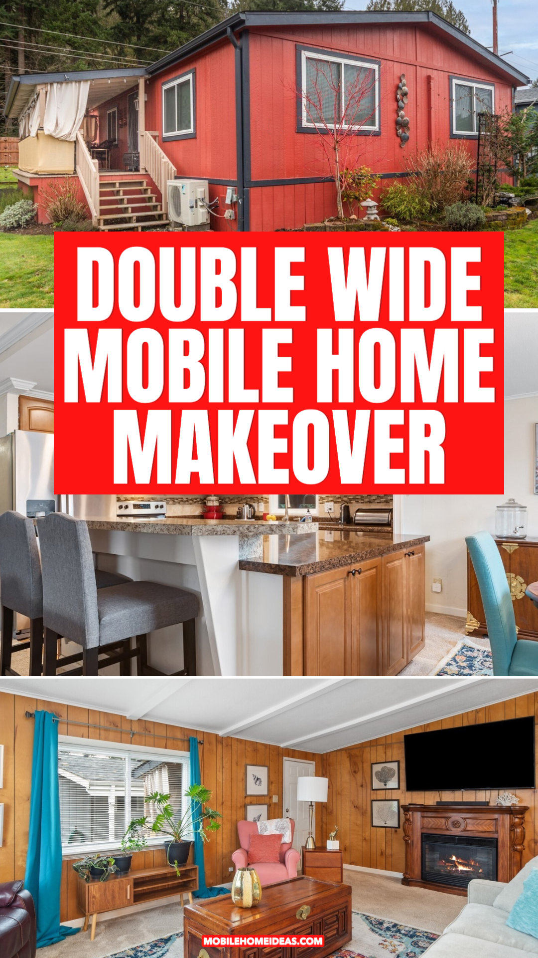This double-wide mobile home shows how simple updates and bold choices can transform a space. The bright red exterior makes a big first impression. Inside, warm wood, cheerful colors, and thoughtful layouts create comfort and charm.