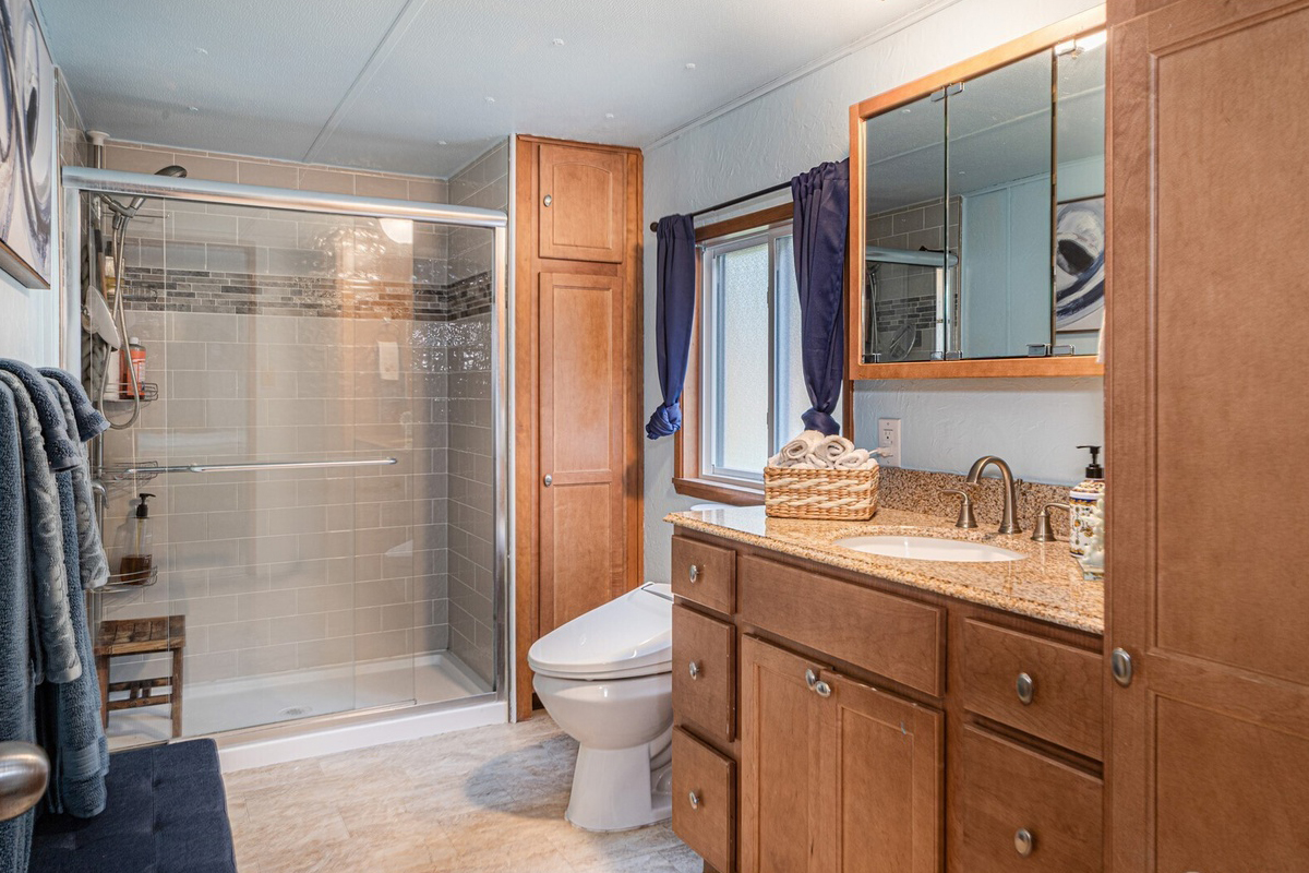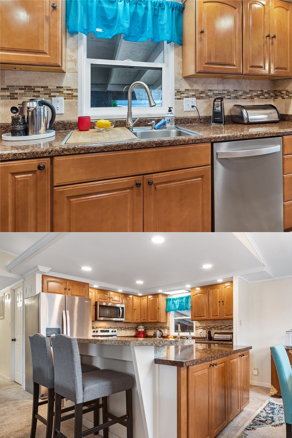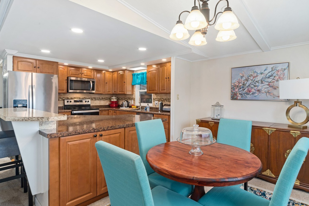 The warm wood cabinets offer lots of storage, and the granite counter feels sturdy and smooth. It’s simple, clean, and easy to love.