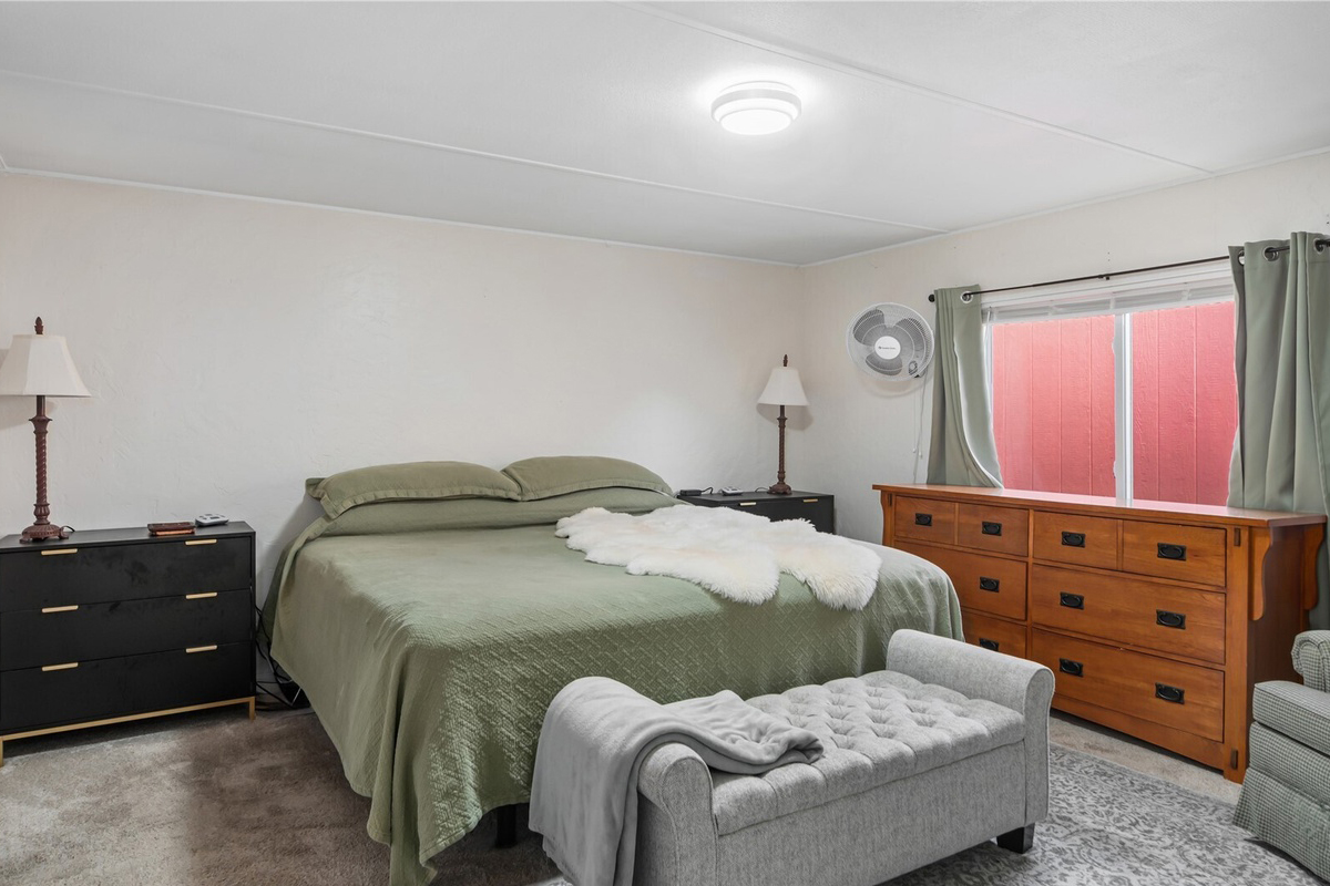 The bedroom feels simple and restful. Light walls and soft carpet create a quiet backdrop. The muted green bedding adds gentle color without overwhelming the room.