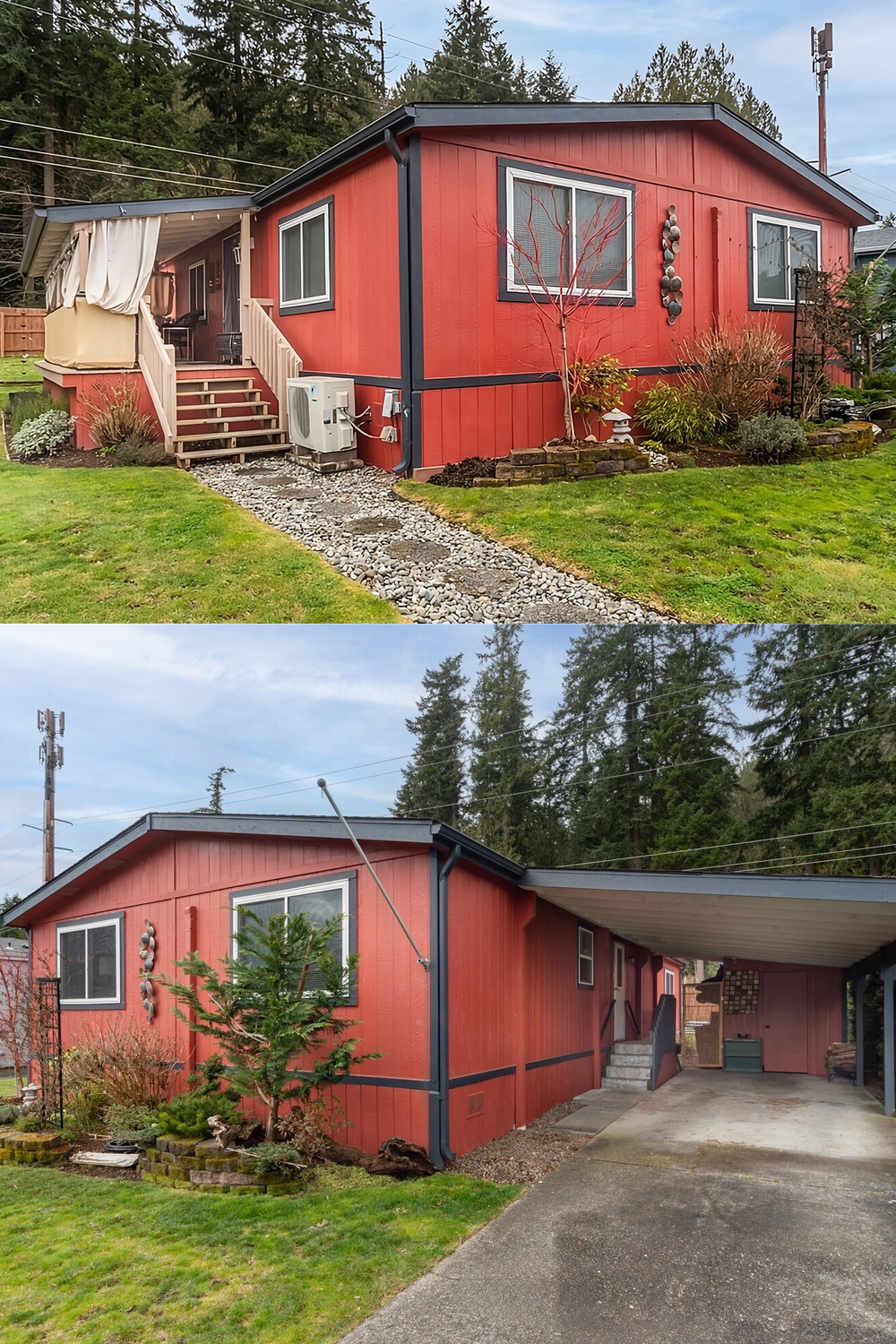 This home stands out in the best way. The bright red siding brings instant energy. It feels warm, fun, and inviting. Deep charcoal trim lines the windows and edges. The contrast looks sharp and gives the home a neat, modern touch.