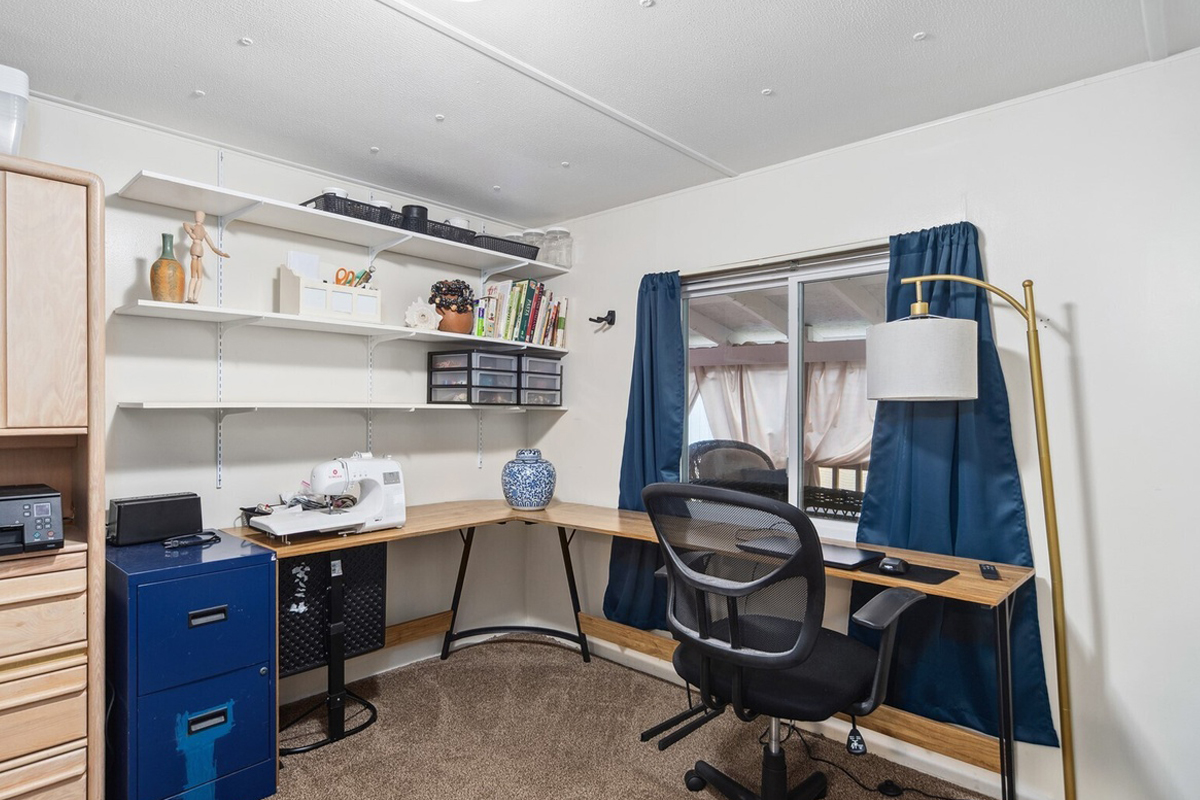 This bonus room makes great use of every corner. A long corner desk stretches across the wall and gives you lots of workspace. Open shelves hold books, tools, and craft supplies.