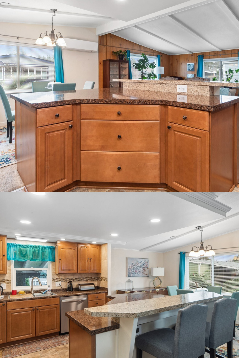 The large peninsula pulls the kitchen and dining area together. It gives you extra counter space for cooking. It also doubles as a breakfast bar for quick meals.