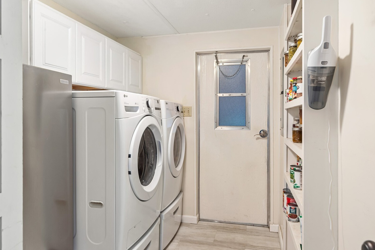 This laundry room makes chores easier. The washer and dryer sit under white cabinets that hold all your supplies. The small built-in pantry adds even more storage.