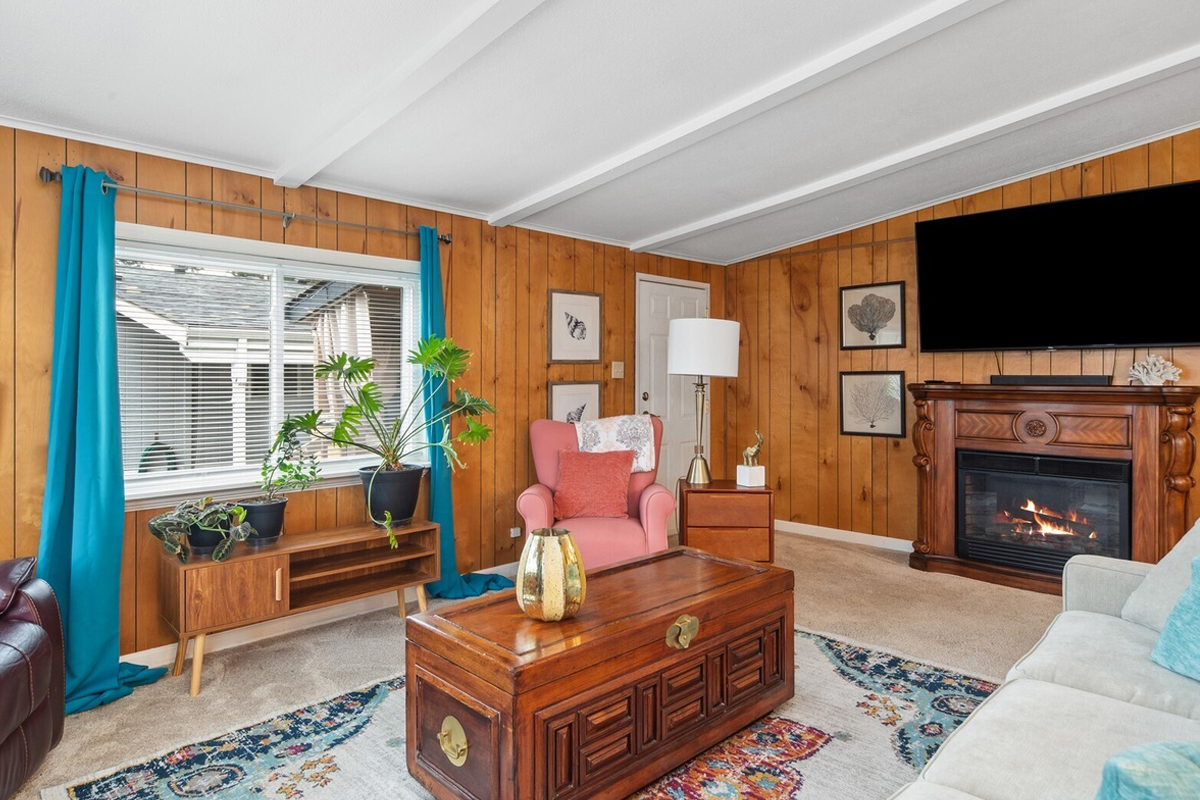 When you step inside, the living room greets you with warm wood-panel walls. The wood adds texture and charm. Instead of feeling dated, it feels cozy and full of character.