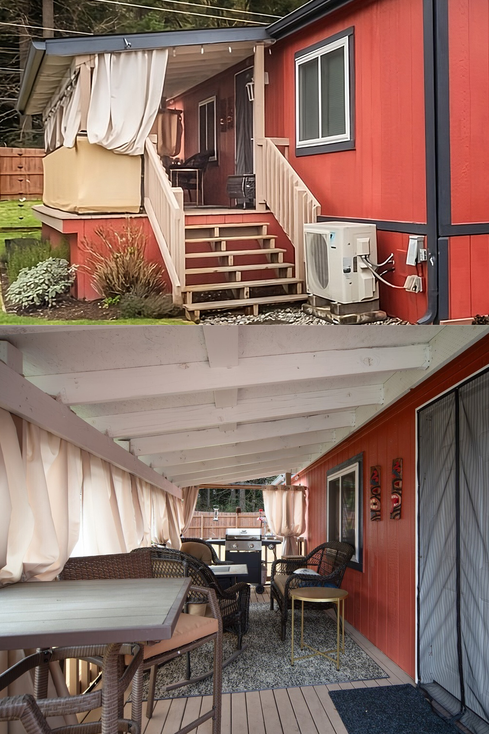 When you reach the porch, the mood shifts to calm and comfy. Pale curtains drape along the sides. They bring softness and a breezy look. Wicker chairs and a small table make the space feel like a relaxed outdoor living room.