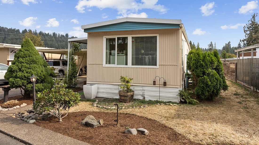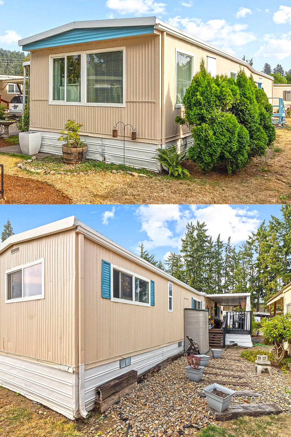 The outside of this home feels bright and happy. Creamy tan siding with crisp white skirting makes everything look clean. Light blue trim on the porch and roofline adds a fun pop of color. It’s a friendly look that makes the home stand out without being loud.