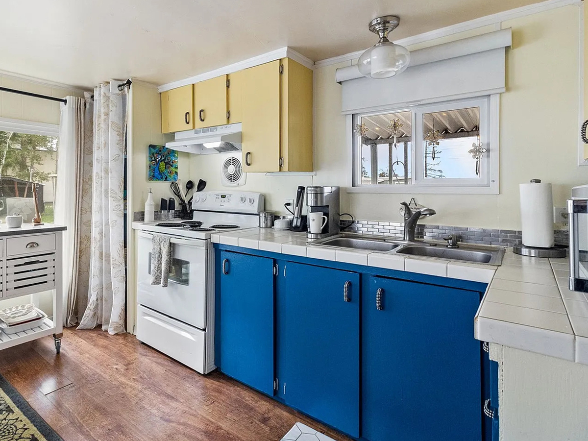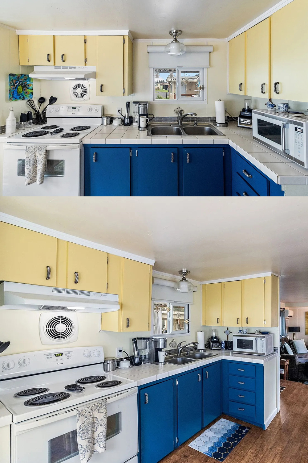 The kitchen is cheerful and bright! The lower cabinets are painted a bold blue. The upper cabinets are sunny yellow. Together, they make the space pop. White tile counters and a matching stove keep the look fresh and clean.