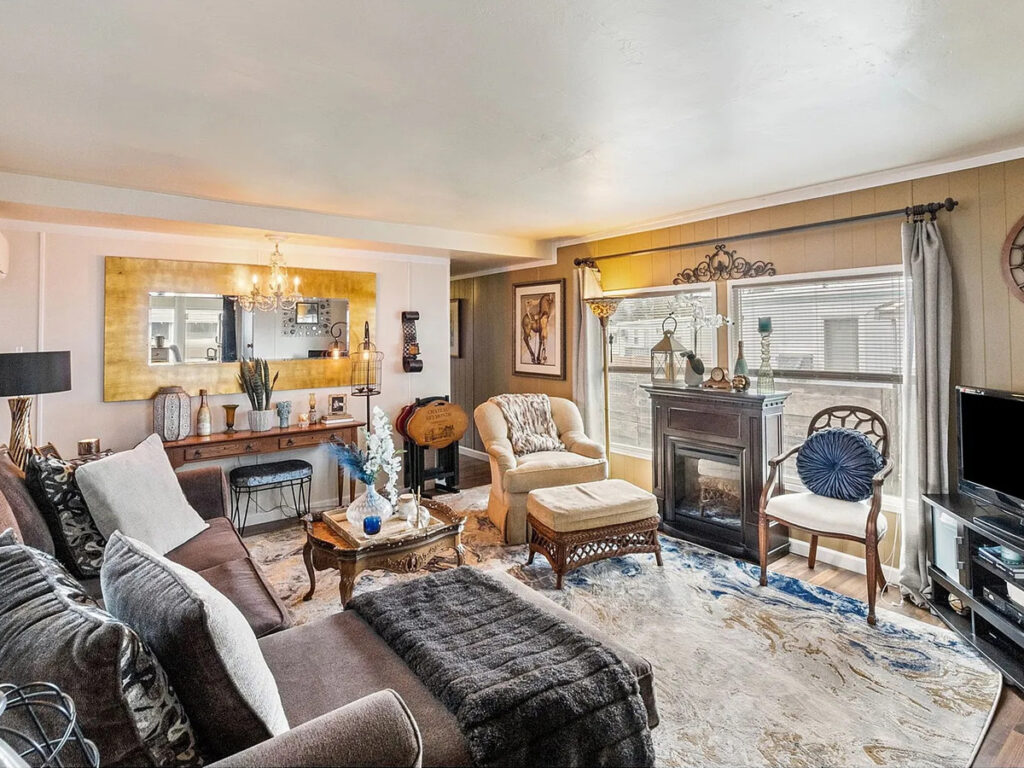Pretty details make the room feel extra special. A gold mirror, fancy lamps, and some art add a splash of personality. The electric fireplace makes the room feel warm and cozy, even when it’s not on. There’s just the right mix of new style and old charm.