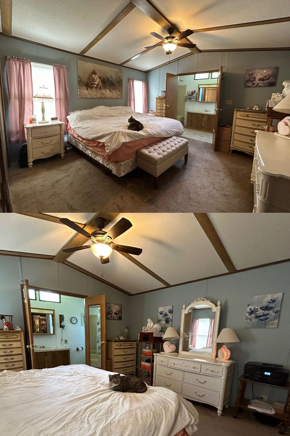 This main bedroom is a treat. Vaulted ceilings and extra space make it feel open, even with a big bed. There’s room for dressers, nightstands, and a soft bench for sitting.