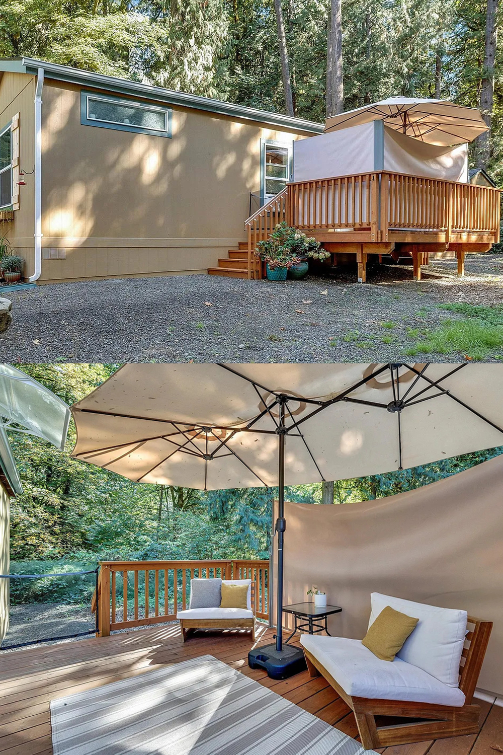 Step around back and there’s a deck made for lounging. A big umbrella gives shade, while a soft bench and some pillows make it cozy. This is the spot for morning coffee, dinner outside, or a lazy Sunday nap. Try a simple rug and string lights for even more charm.
