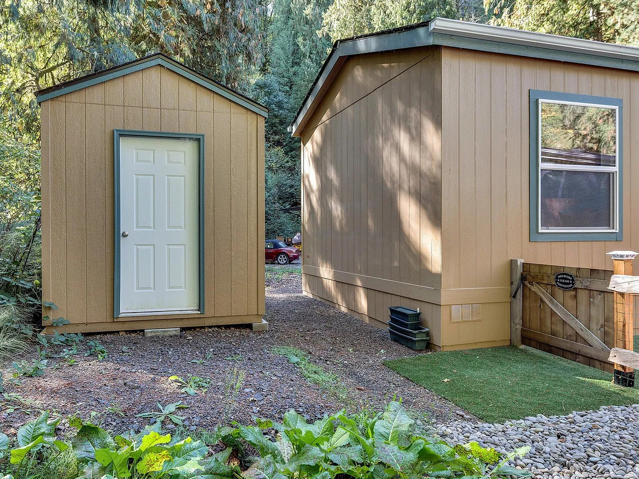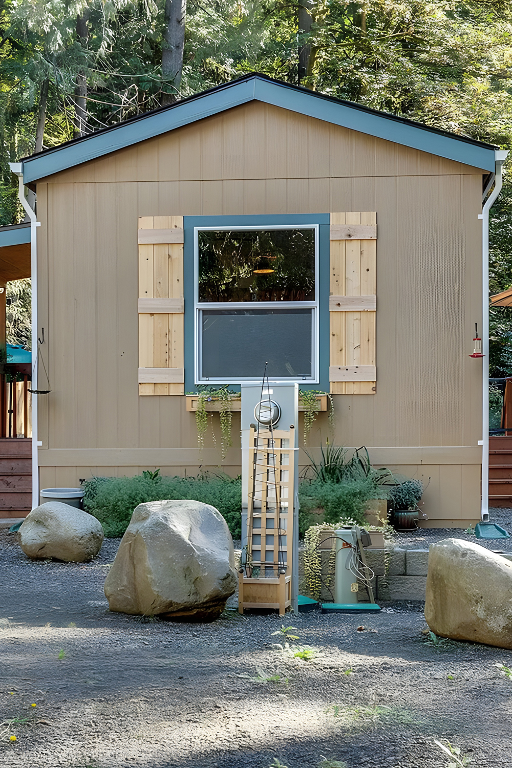 See the small shed next to the house? It matches the home and keeps garden tools or holiday stuff out of sight. A matching shed makes your yard feel neat and planned, not cluttered.
