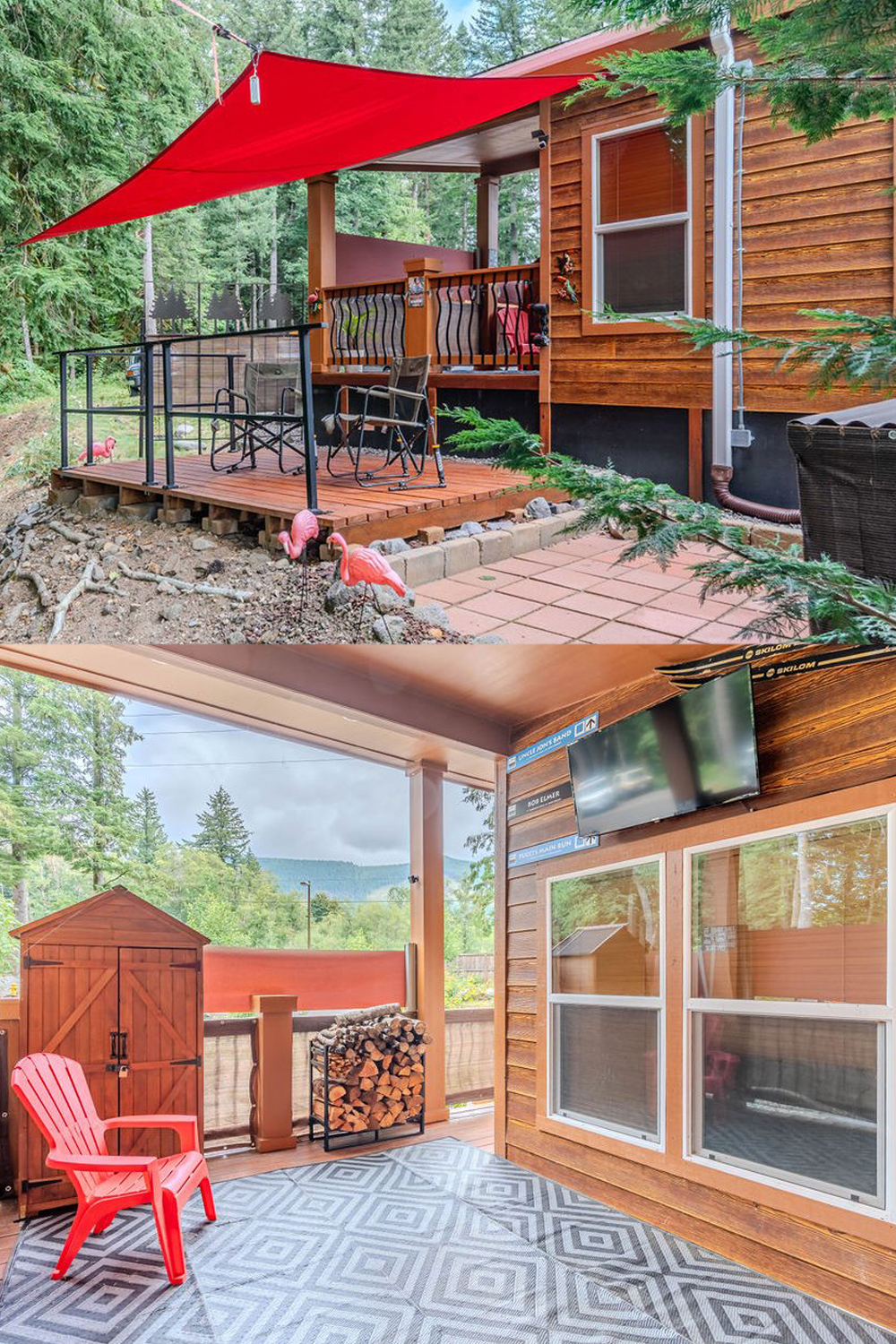The right touches make all the difference. Hang vintage skis, oars, or forest art on your walls. Toss faux fur throws or plaid blankets on the sofa. Try lantern lamps, pinecone decorations, or even playful touches like pink flamingos on the porch for a smile.