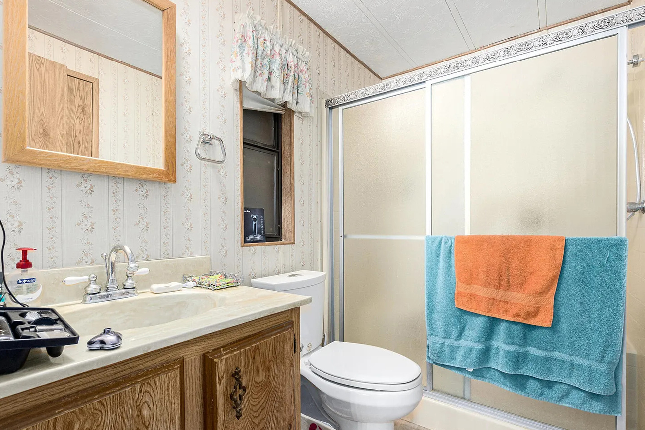 This bathroom shows that function often leads the design in mobile homes, and that is okay. A room can feel basic and still work well.