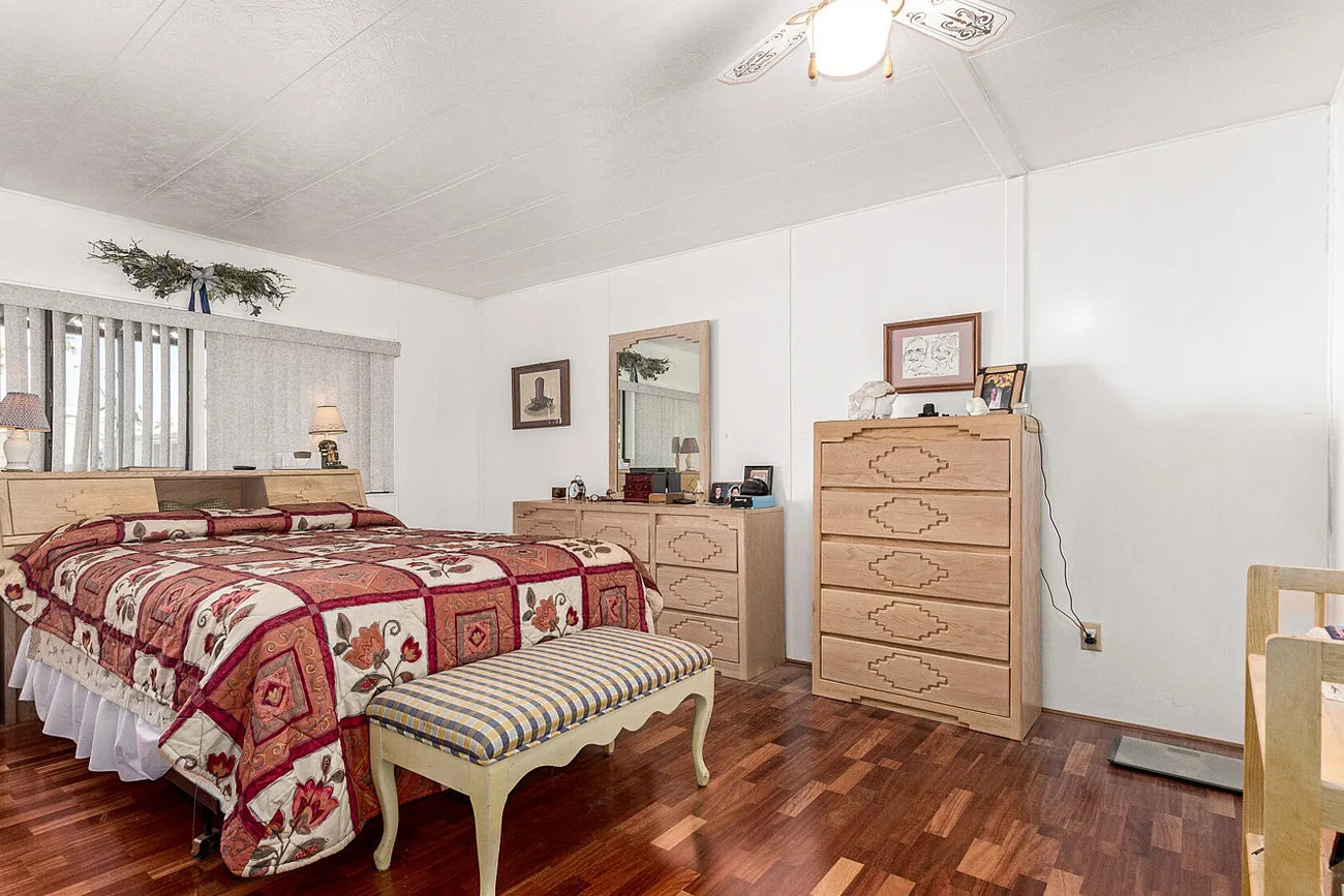 The bedroom is another pleasant surprise. It has a generous footprint, which gives it a calm, uncluttered feel. Large bedrooms are one of the biggest perks of many double wide layouts, and this room shows why. There is space for the bed, nightstands, dresser, chest, and even a bench, yet the room still feels open.