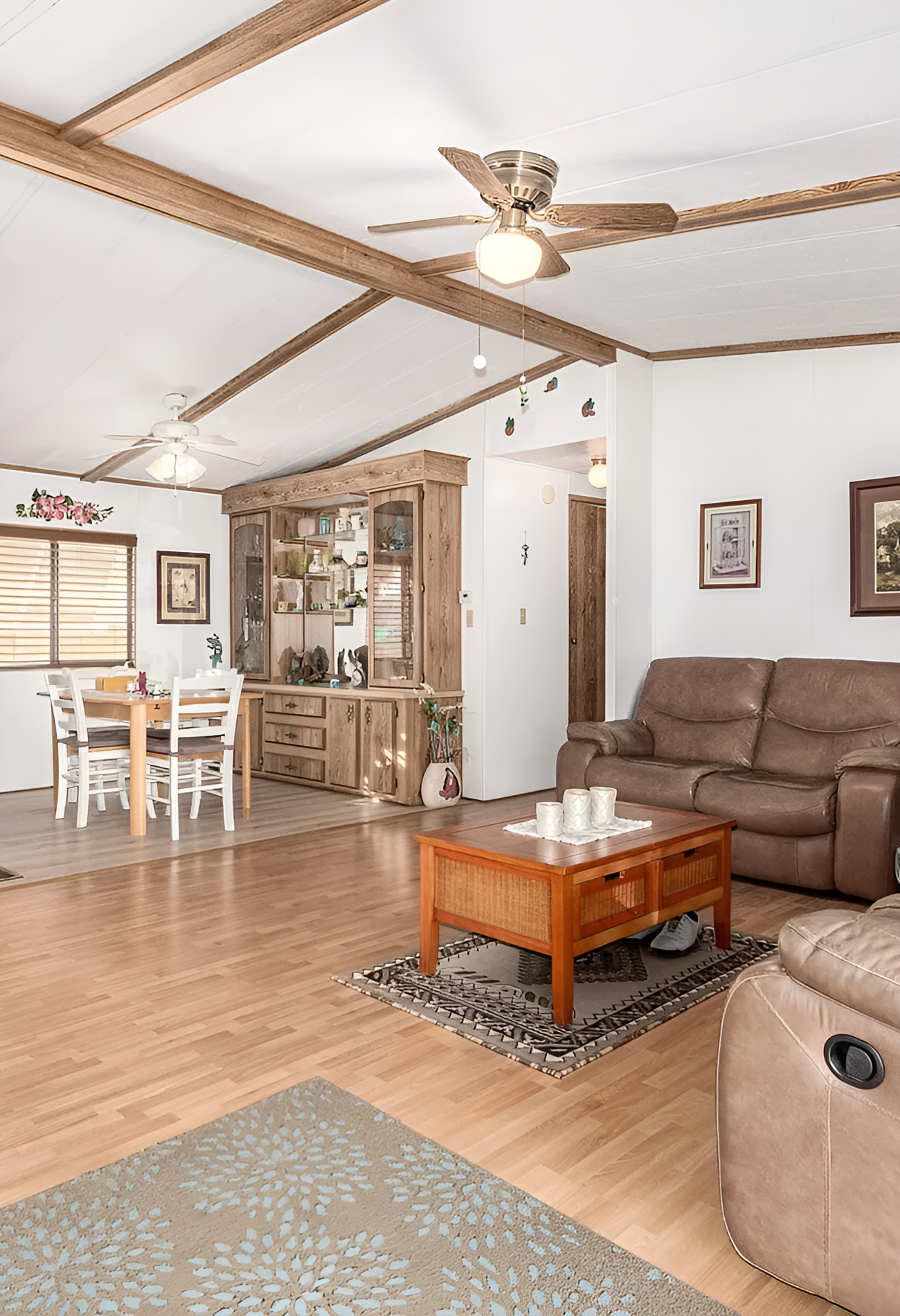 One feature that adds a lot of charm to the shared living and dining area is the wood-look ceiling trim. It creates the effect of beams, which gives the ceiling more movement and interest. In a large open room, that kind of detail helps prevent the ceiling from feeling flat or blank.