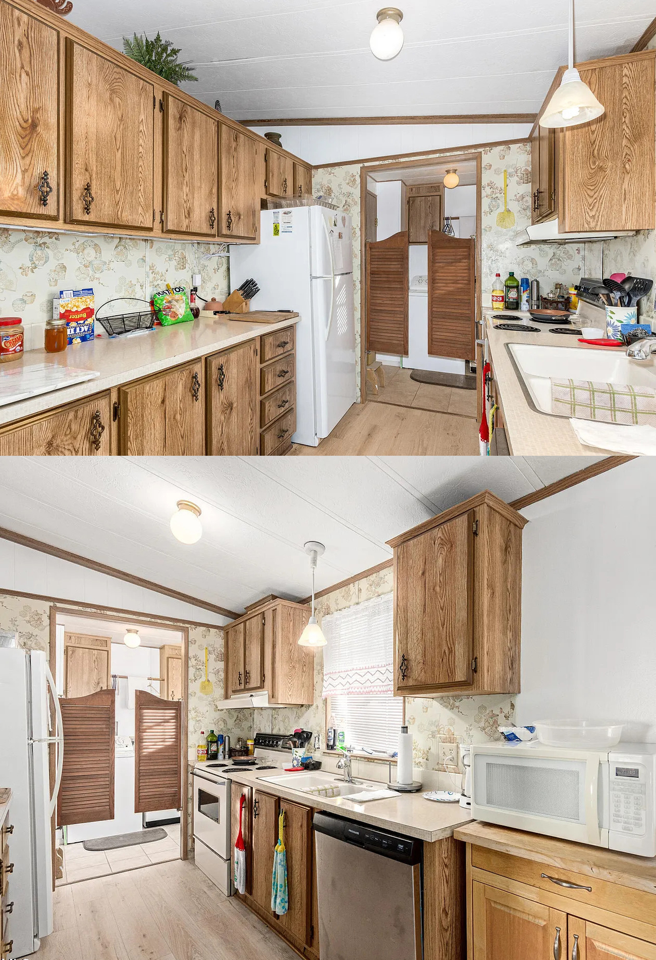 Inside, the kitchen tells a very different story from the exterior. While the outside feels freshly updated, the kitchen keeps a strong classic mobile home look. That is not a bad thing. In fact, it gives the home a lot of personality.