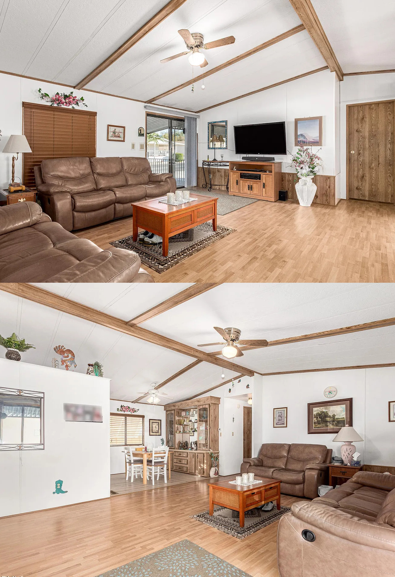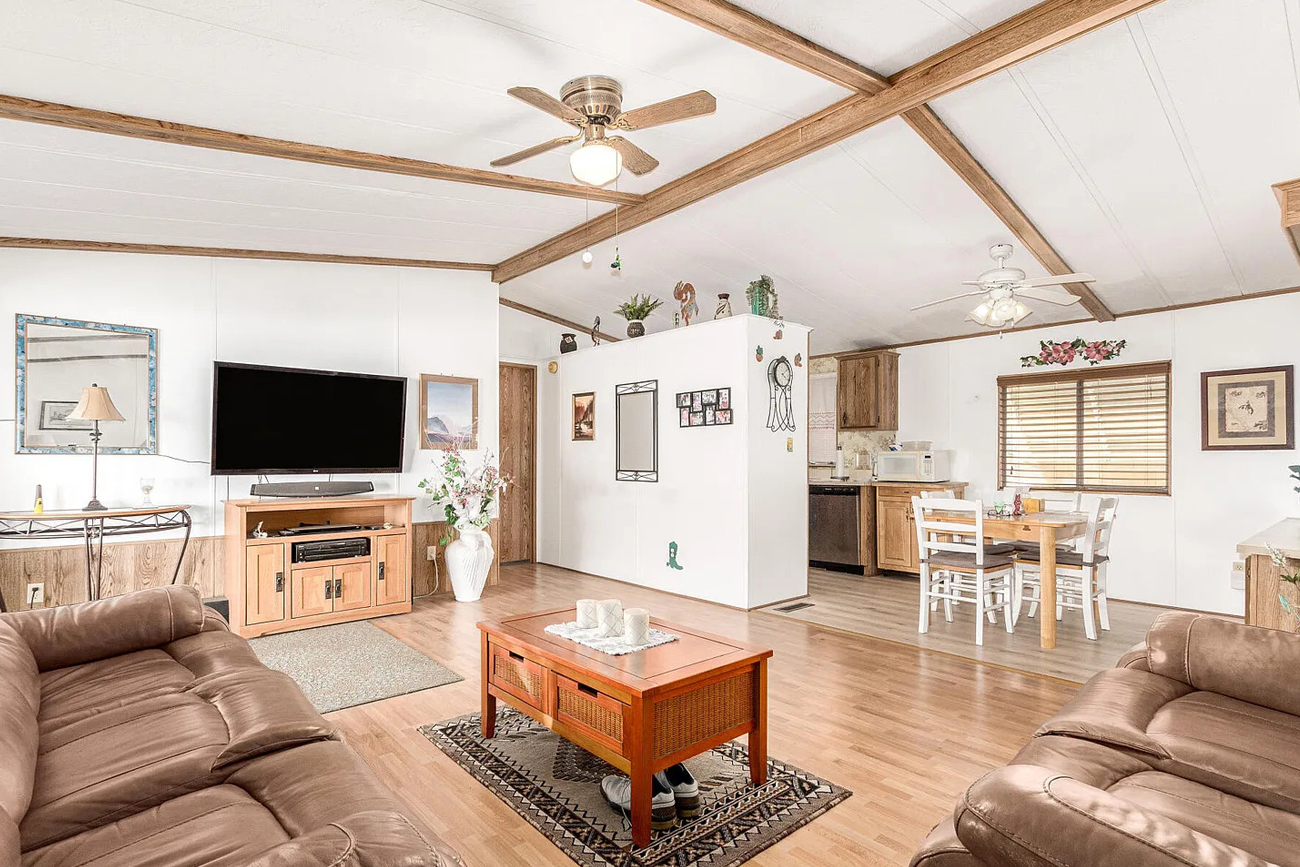 This is especially useful in double wide homes because the open spaces can sometimes feel visually loose. The ceiling trim helps organize the room without using walls.