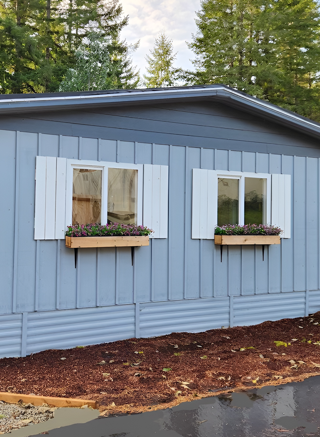 One of the nicest parts of this exterior is how the shutters and flower boxes soften the home’s shape. Mobile homes often have long, flat walls, so little accents like these can make a big difference. Here, they break up the siding and make the windows feel more intentional.