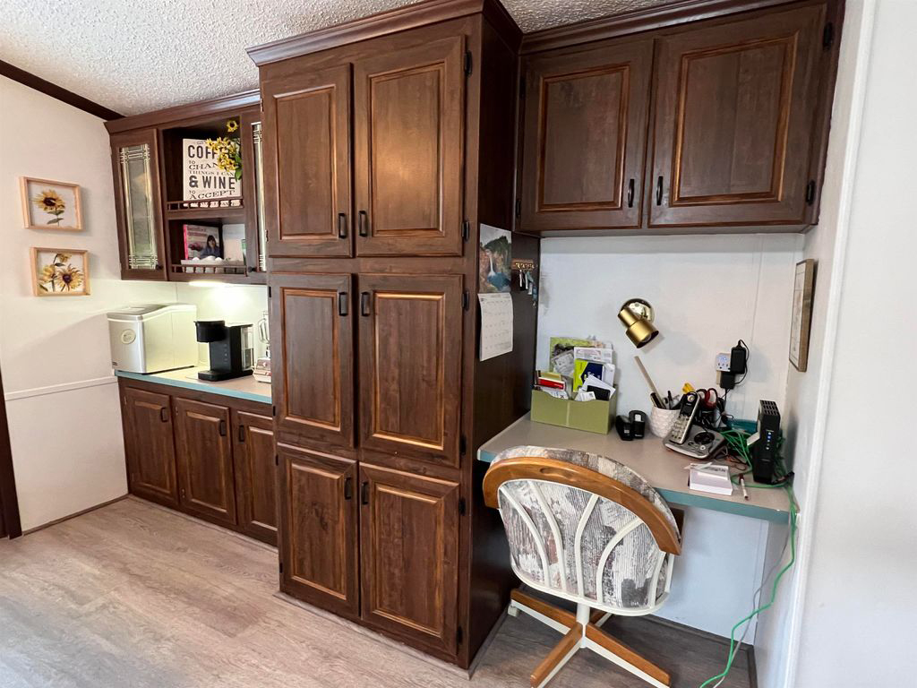 Just off the kitchen is a clever built-in setup that combines a coffee bar and a mini office. The upper cabinets hold mugs and supplies, while the countertop below fits a coffee maker perfectly.