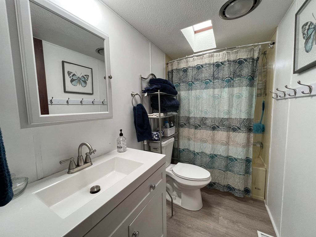 The guest bathroom is equally well-designed. A skylight above the shower fills the space with natural light. The patterned shower curtain in soft blue and gray tones ties in beautifully with the home’s coastal color theme.