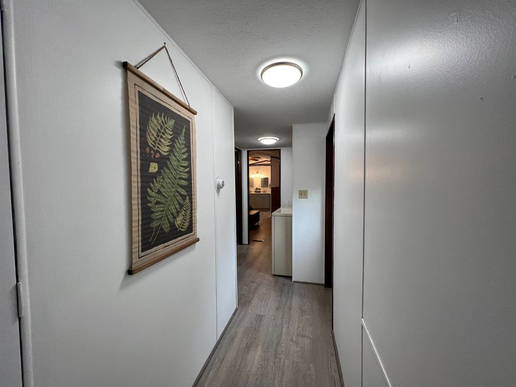 The hallway connecting the rooms is bright and uncluttered. White walls reflect light from the ceiling fixtures, and a simple botanical wall hanging adds interest without overwhelming the space.