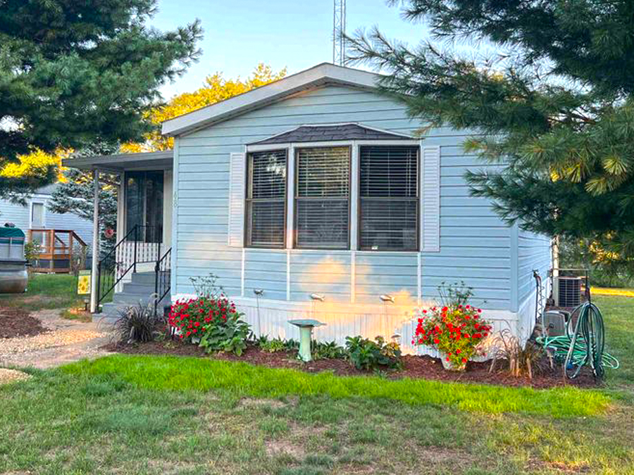 The light blue siding and crisp white trim give this home a cheerful, coastal look. It feels fresh and inviting, like a summer cottage that you never want to leave. Large front windows bring in sunlight while offering a charming view of the yard. Below them, neat flower beds with bright blooms and green foliage add warmth and life to the front.