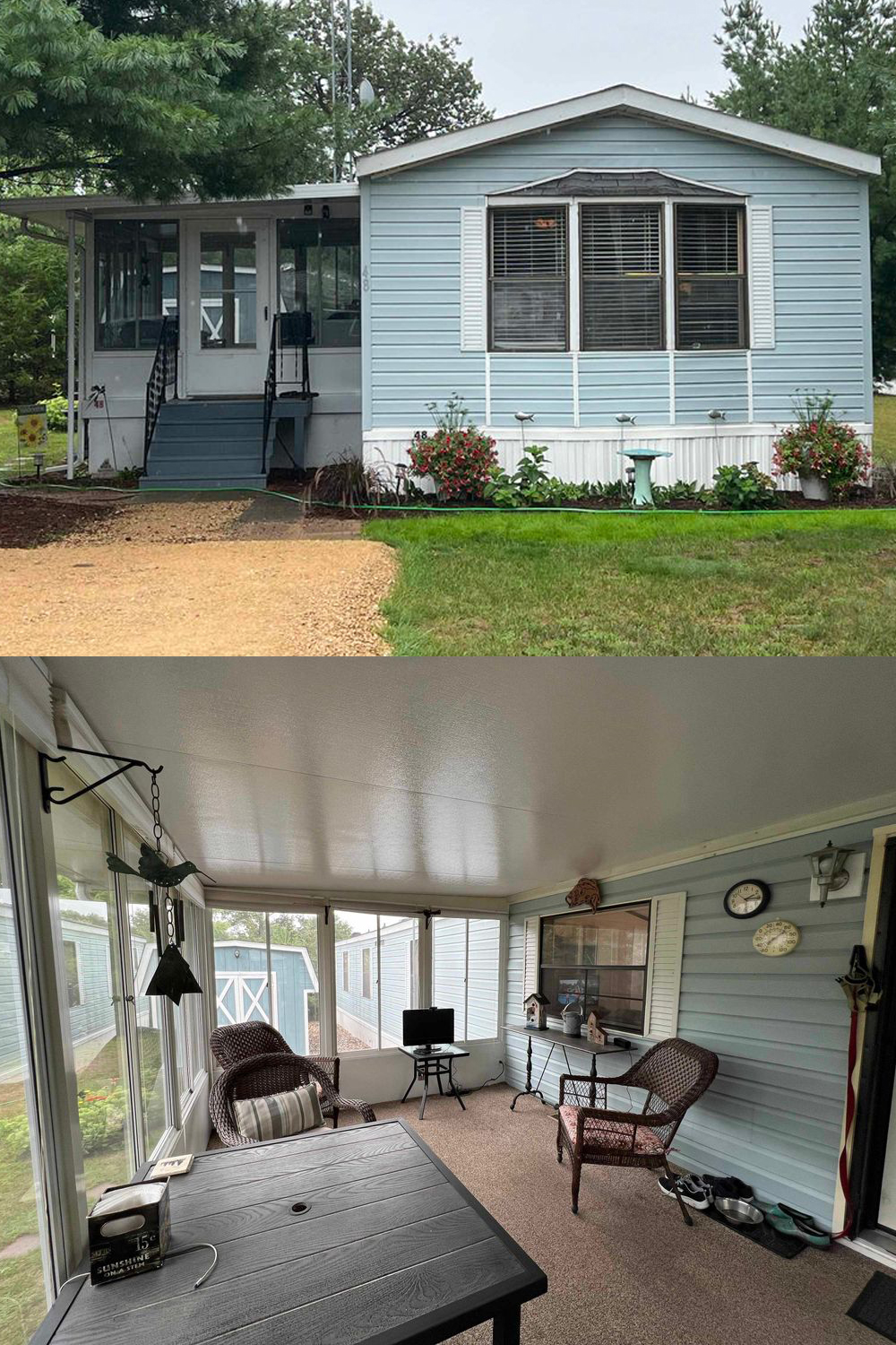 The wide windows let in plenty of light, while the carpeted floor adds warmth underfoot. Simple wall décor, small potted plants, and bird-themed accents make it feel peaceful and personal. Rain or shine, this porch offers a place to unwind and enjoy nature without stepping outside.