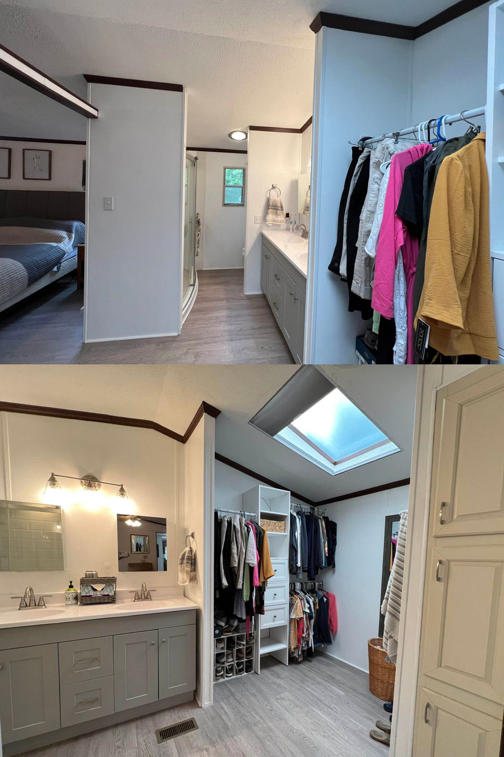 Through the bedroom, you’ll find a bright, stylish ensuite bathroom. It features a large double vanity with modern faucets and plenty of counter space. Soft lighting above the mirrors creates a warm glow that feels like a spa.