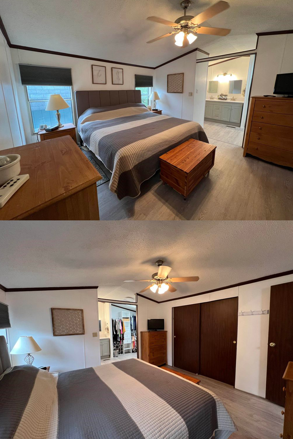 The master bedroom is cozy and calming—a true retreat after a long day. The color palette stays soft and neutral, with white walls, warm wood tones, and a striped quilt in shades of gray and beige.